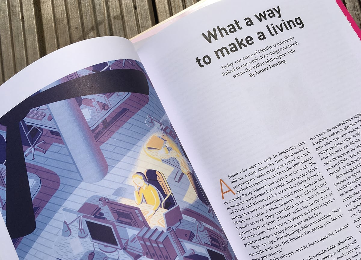 We’re a small team and we all work part time, so it varies depending on how close we are to publishing an issue. In a typical three-month cycle, we might spend a few weeks reading around and meeting writers to come up with ideas for pieces, then a few weeks planning out an issue — our designer Emily Foster plays a really important role here, particularly when it comes to our cover concepts — and starting work on the edits. Then, in the final weeks before publication we’re tied to the production line, getting pages laid out and finished off. A copy editor and proof-reader come in to help us get everything off to press on time. Somewhere among all that we try to find time to plan other projects — events, marketing, placing our pieces with larger outlets, such as the Guardian’s Long Reads.