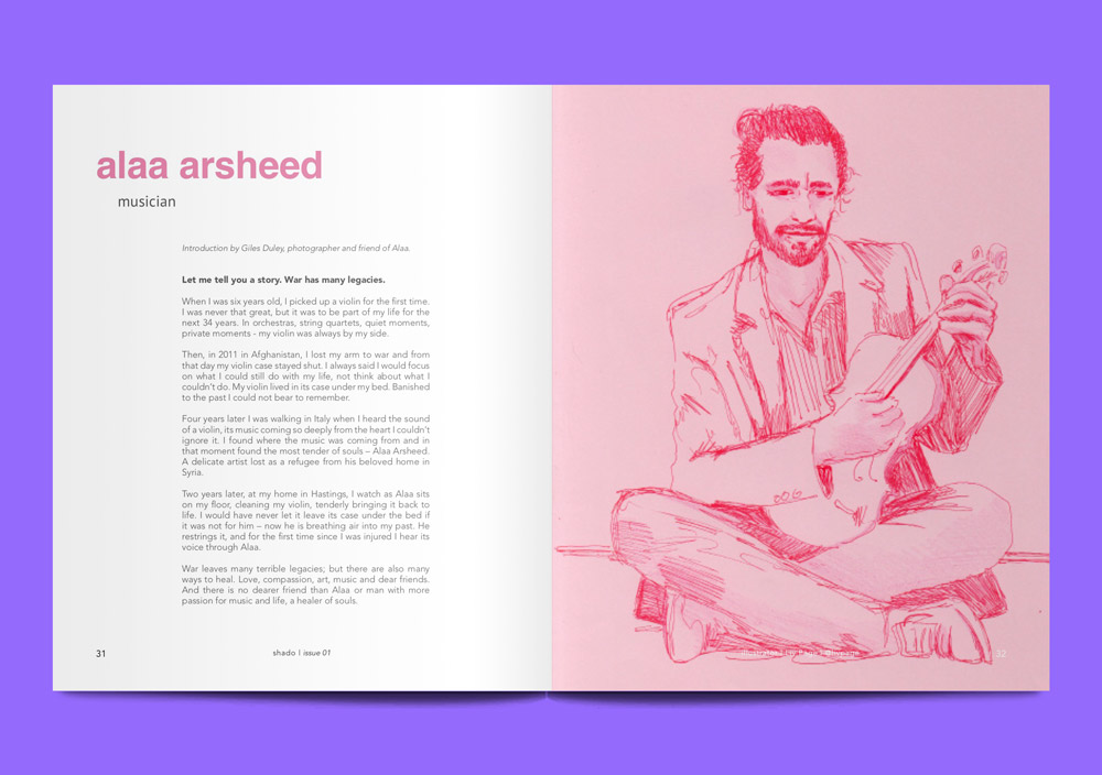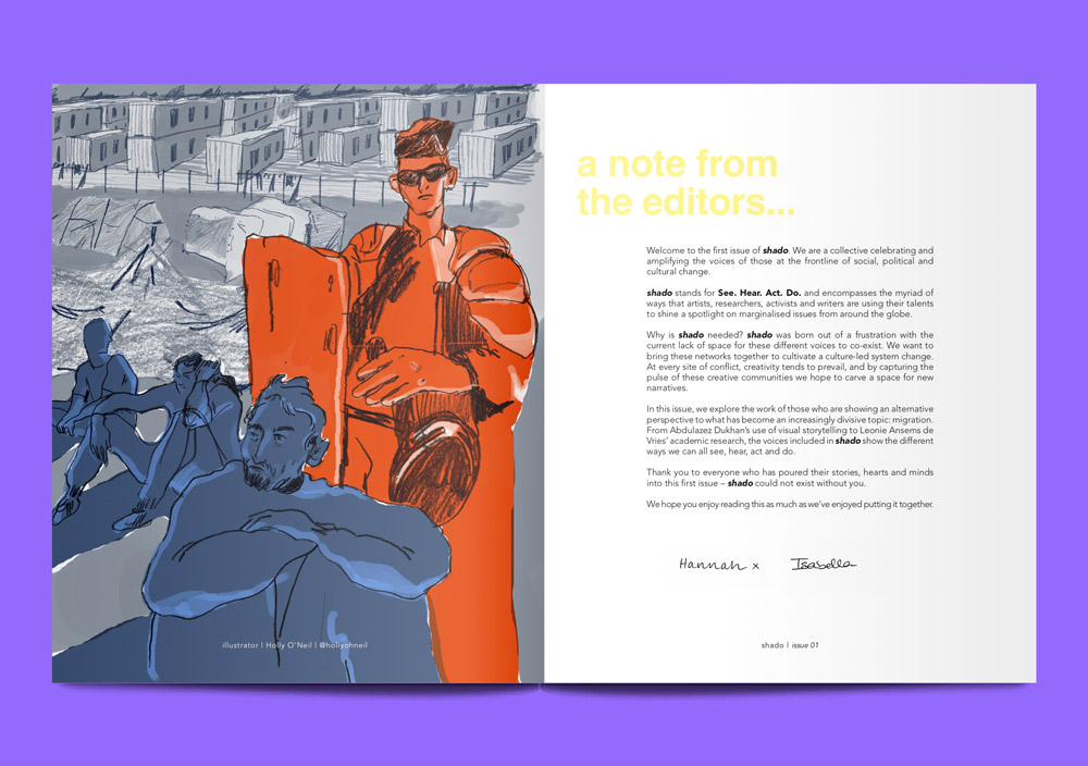 Shado is a collective trying to make space for people to tell their own stories. Issue one focuses on migration, and 70% of its contributors have refugee or asylum-seeking status. The priority, as editors Hannah Robathan and Isabella Pearce explain, “was moving away from the stereotypical, singular narrative of migration”. With a focus on the arts as a form of advocacy, on these pages, you will find makers and thinkers whose work both responds to and transcends their circumstances. Like chef Mohammed Rahemah, who invented his signature take on shakshouka over a tiny gas stove in the Calais Jungle, and now hosts Mo’s Eggs, a monthly pop-up brunch in London. Or Iranian visual artist Majid Adin, who just created the official video for Elton John’s Rocket Man.