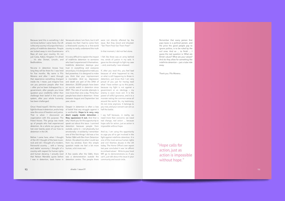 That piece, contributed by Hannah Joy, talks about a situation which is very invisibilised: the 4 stages of PTSD experienced by those forced to flee their homes due to conflict and persecution. There exists a general assumption that the arrival to the UK or another stable country is the endpoint to someone’s trauma. In actual fact, it can sometimes mark the beginning, and it is often precisely at this moment that any mental health impacts are exacerbated. Upon arrival, as well as reconciling personal emotions and accessing painful memories, those seeking asylum are hit with the reality of the stark lack of integration and inclusion facilities in host countries — which obviously have a knock-on effect on ideas of personal belonging and identity. Elsewhere in the issue, Pilo Moreno writes about his firsthand experience of the mental health repercussions of living in indefinite detention in the UK.