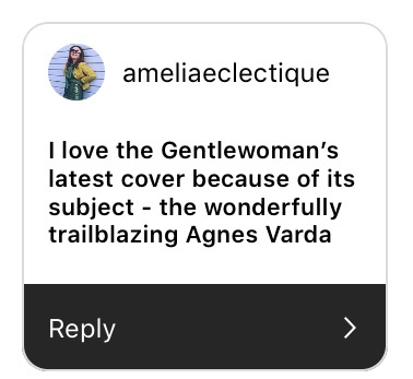 With Good Trouble having already taken home Magazine of the Year at the Stack Awards 2018, Rod Stanley and co can’t feel too aggrieved that September’s cover vote saw them coming in an honourable second. Congratulations, then, to The Gentlewoman, whose striking shot of the iconic Agnès Varda proved irresistible to our readers. And, of course, congratulations to Amelia from Instagram on her new Stack subscription!