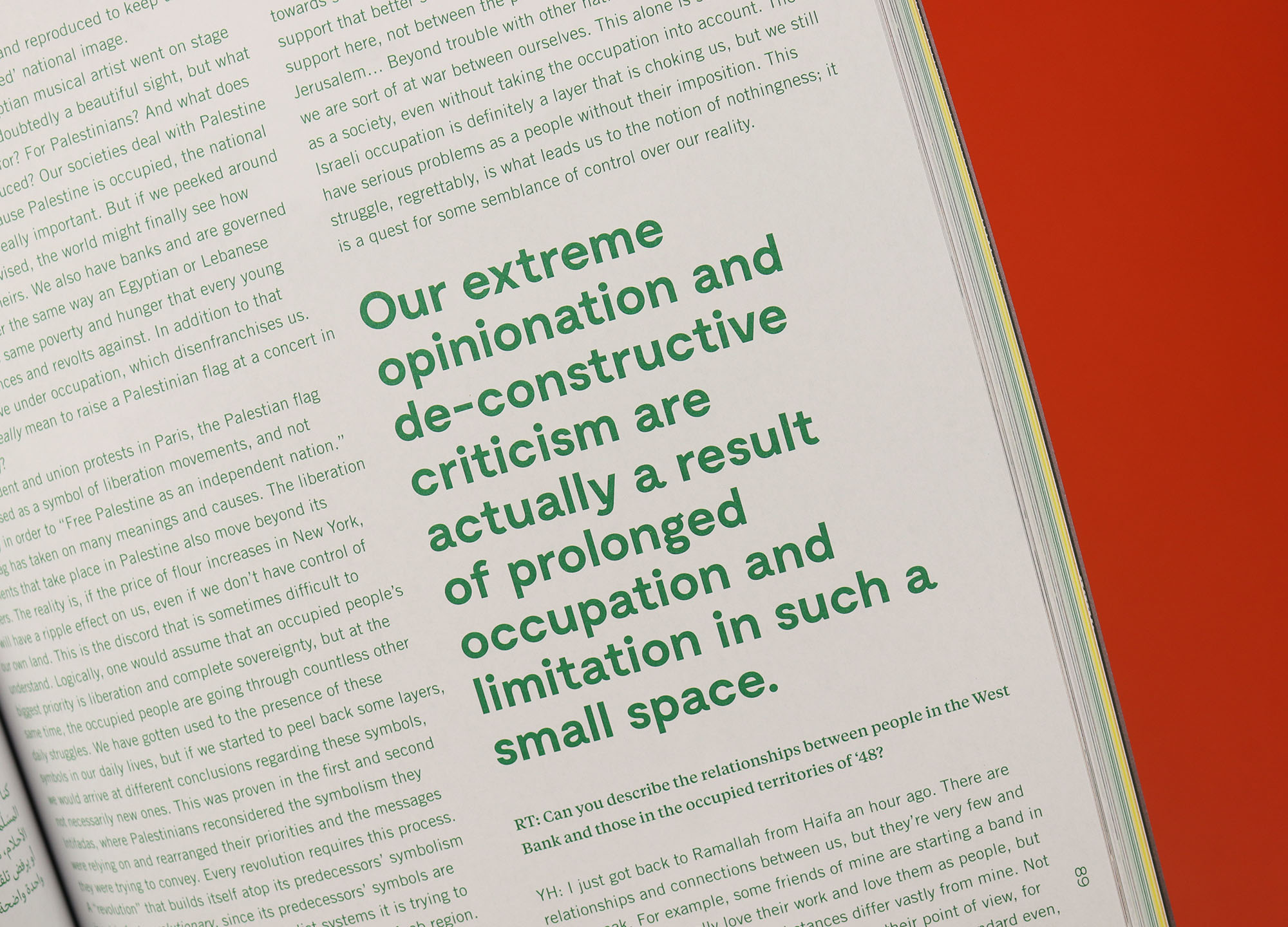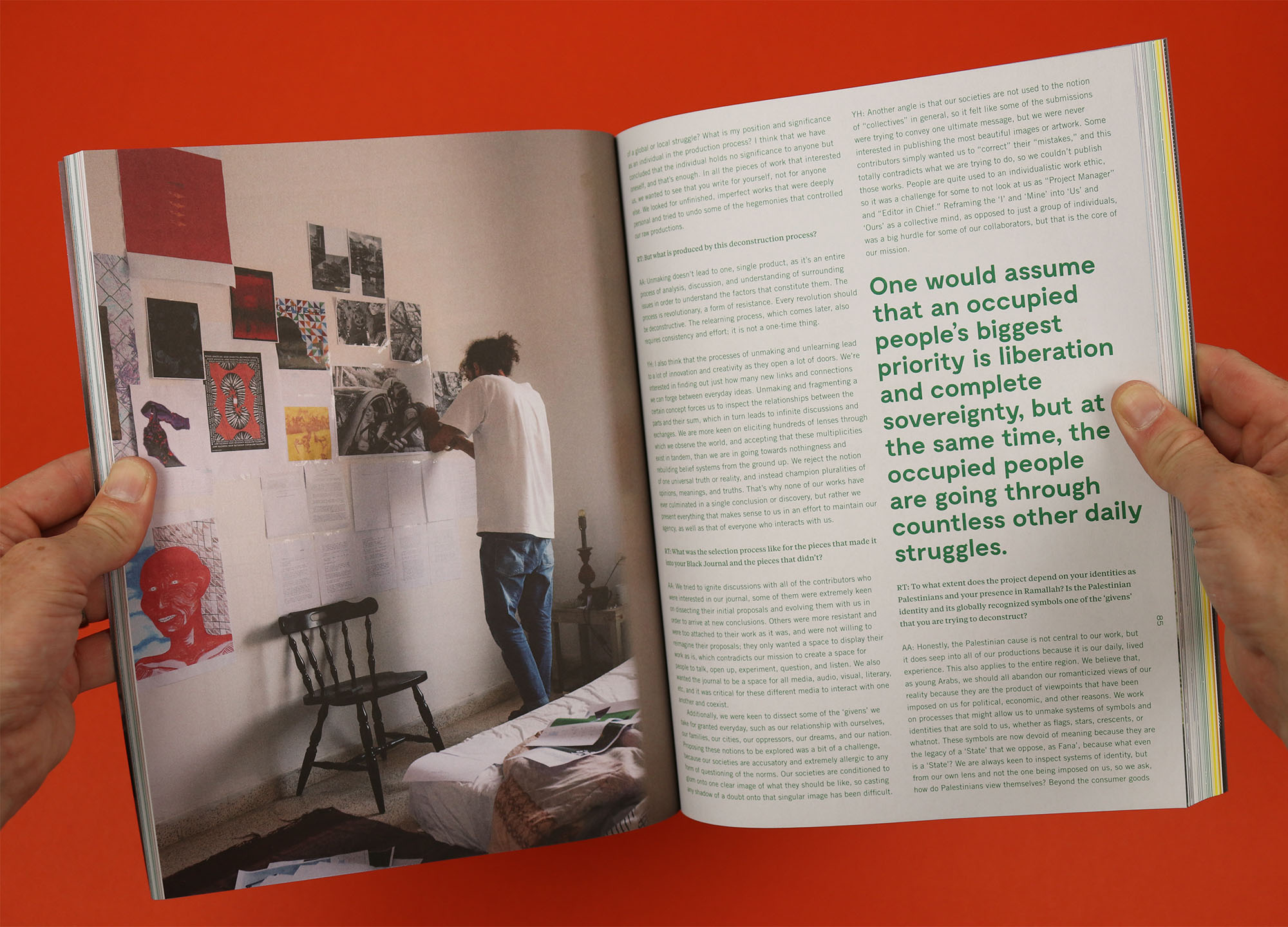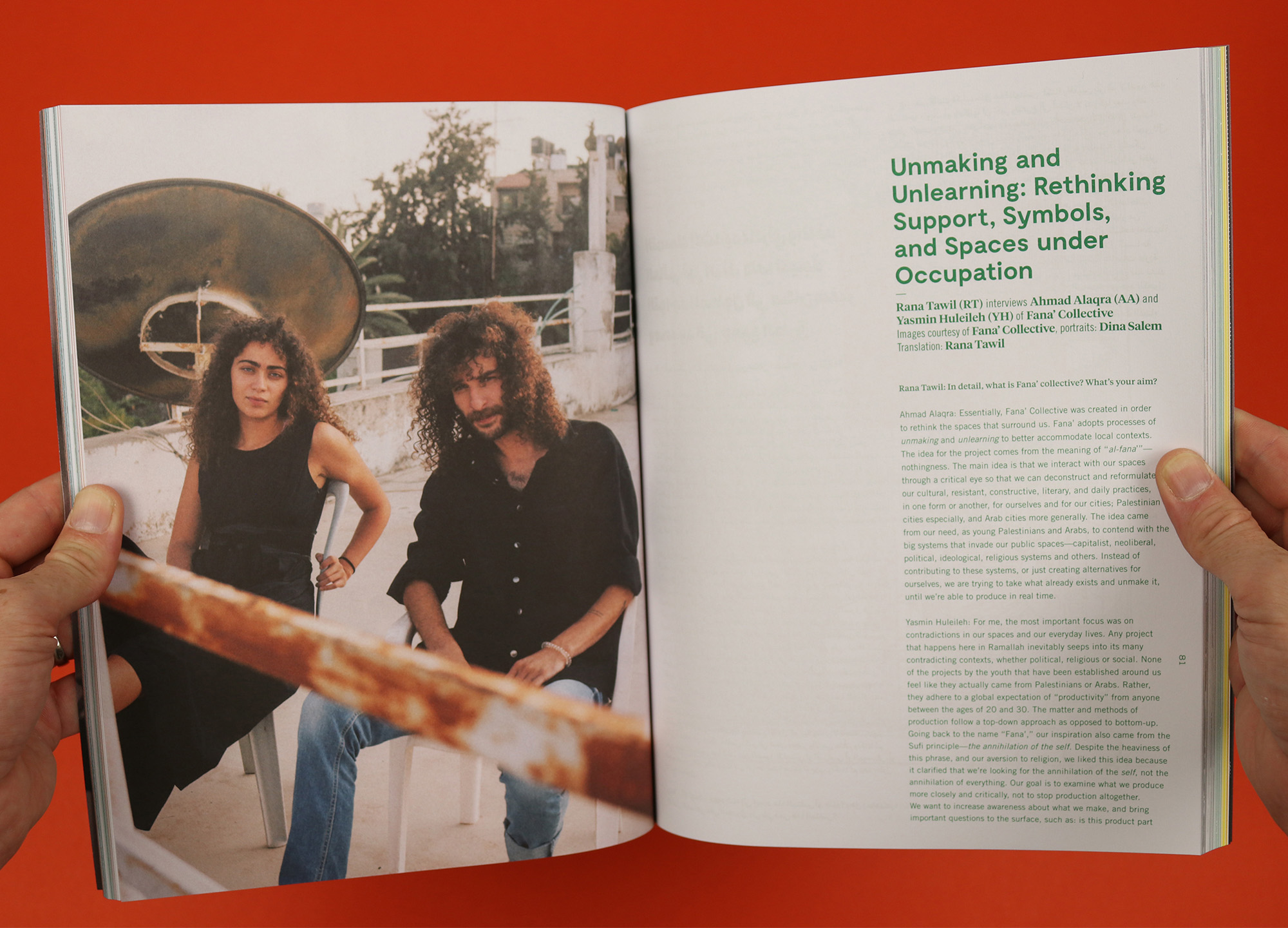 “Honestly, the Palestinian cause is not central to our work, but it does seep into all of our productions because it is our daily, lived experience. This also applies to the entire region. We believe that, as young Arabs, we should all abandon our romanticized views of our reality because they are the product of viewpoints that have been imposed on us for political, economic, and other reasons. We work on processes that might allow us to unmake systems of symbols and identities that are sold to us, whether as flags, stars, crescents, or whatnot. These symbols are now devoid of meaning because they are the legacy of a ‘State’ that we oppose, as Fana’, because what even is a ‘State’?”