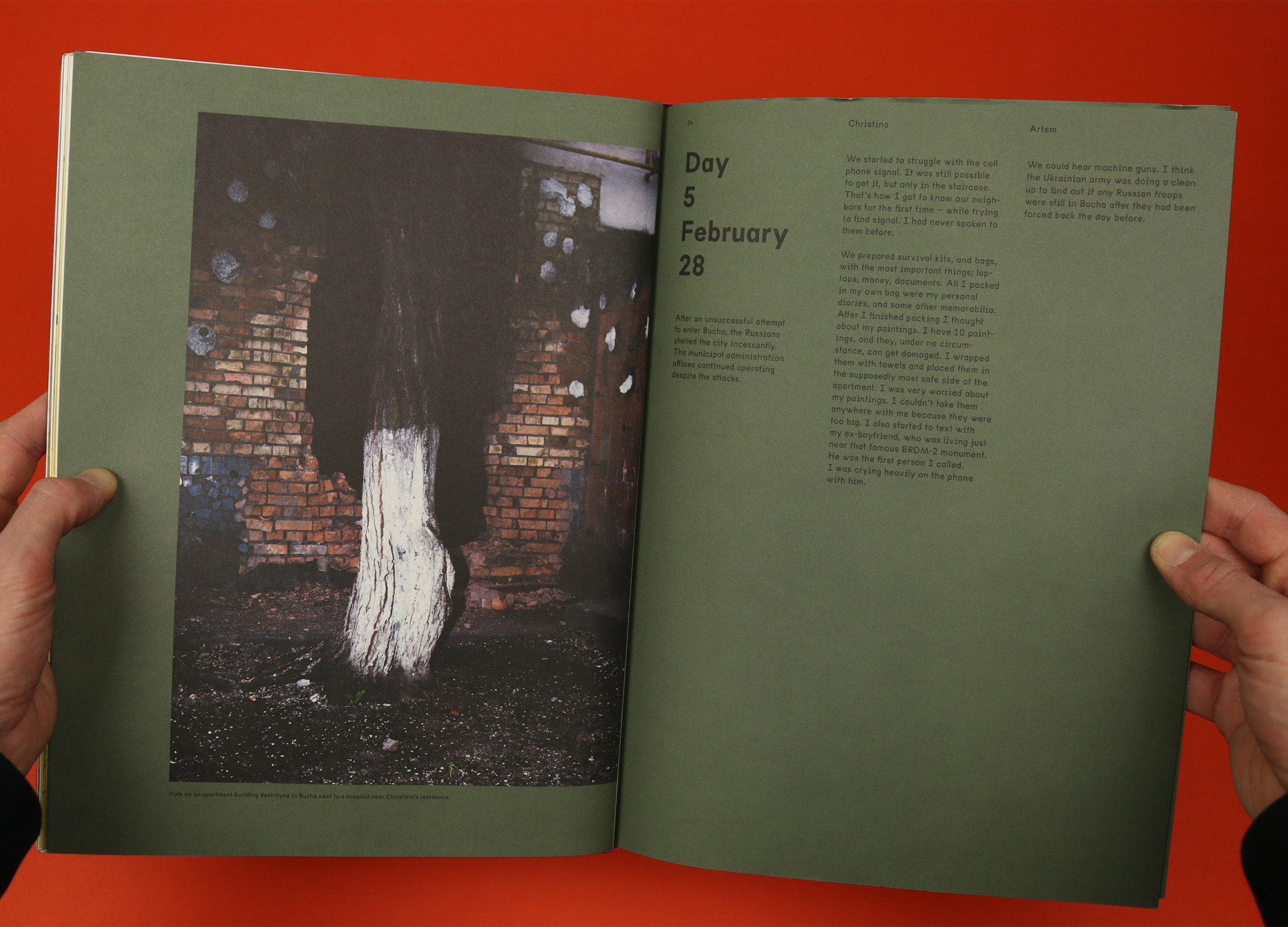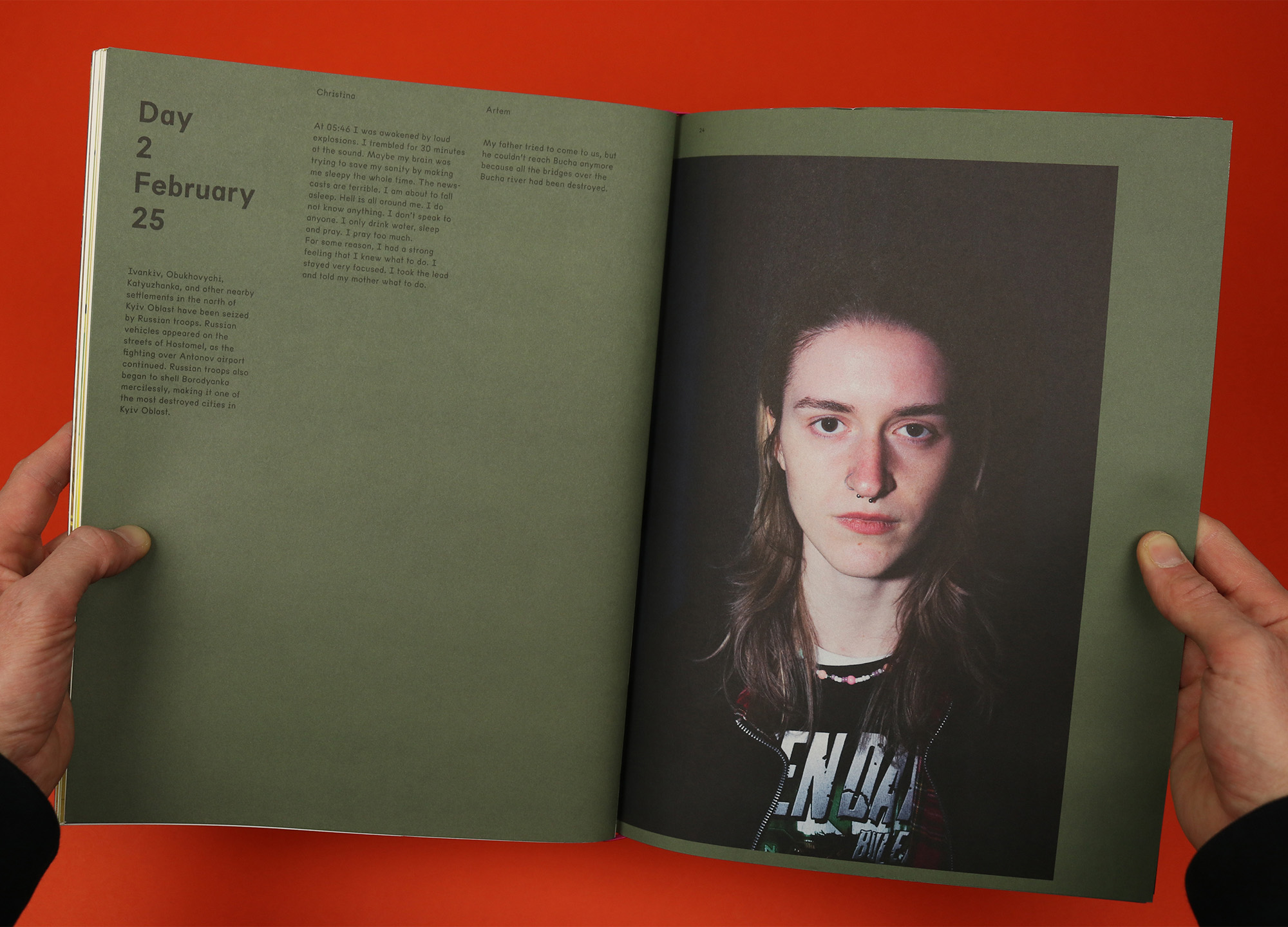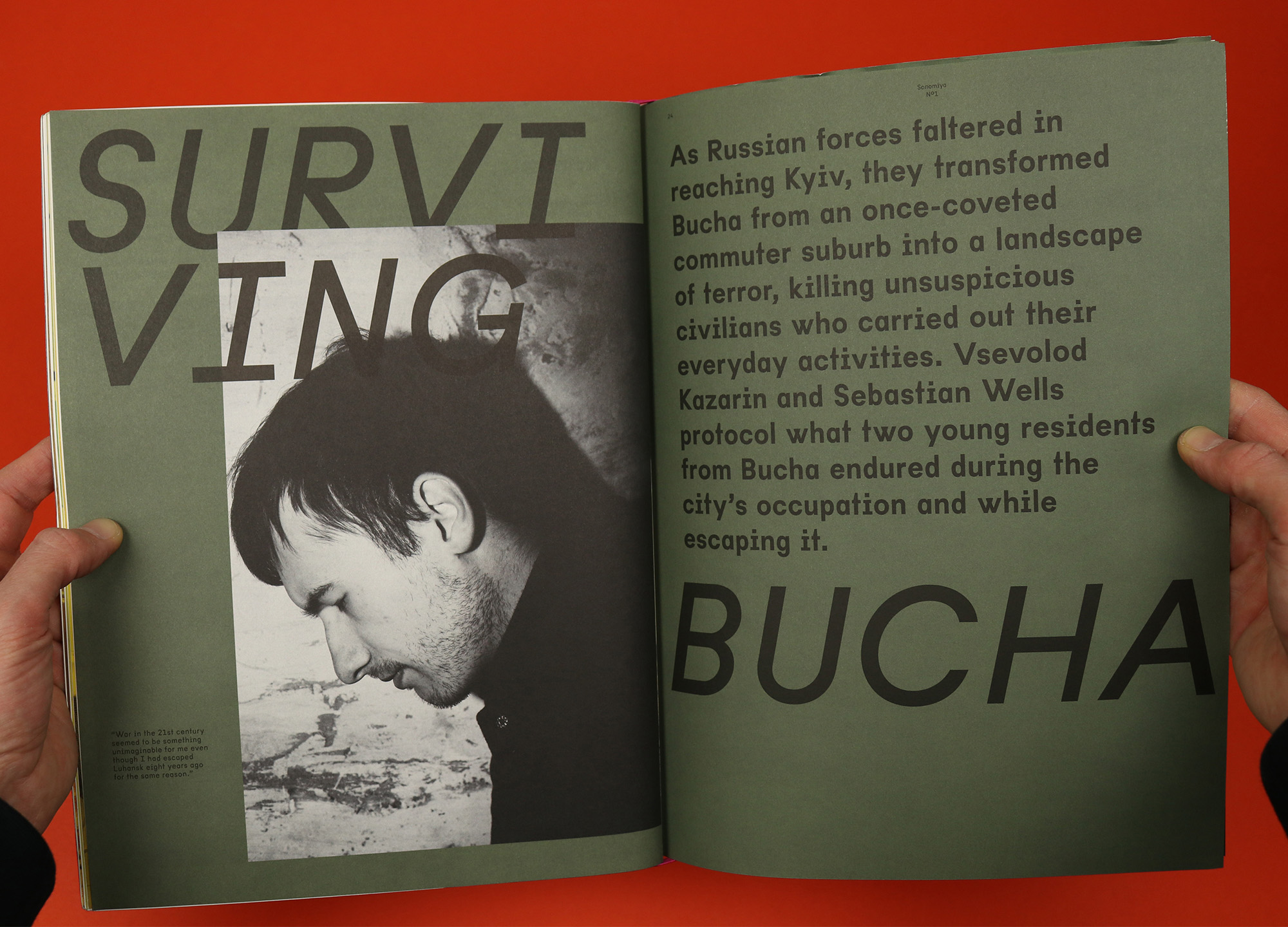 Nowhere is that sentiment illustrated more clearly than in the prologue, Surviving Bucha. Placed at the back of the magazine, separated from the rest of the features and printed with a military green background, it details day by day the horrors endured by students Christina and Artem, beginning with the outbreak of war on the 24th of February and the nightmare that turned their quiet, middle-class town into a symbol for the worst atrocities of war.