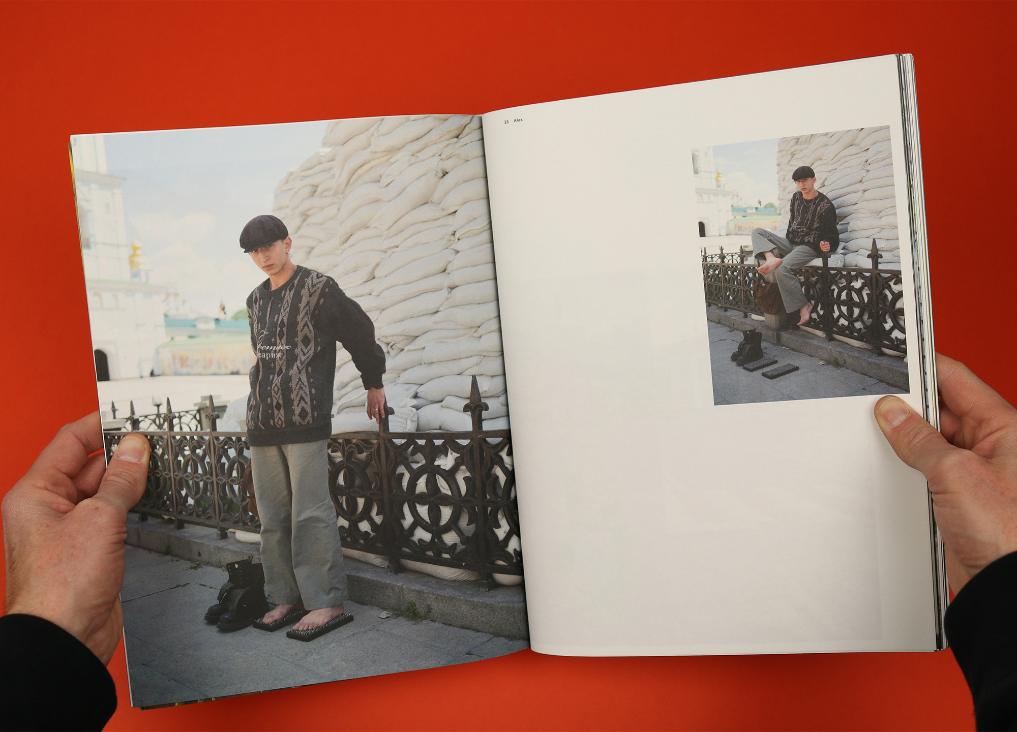 It’s a potent mix – the long photo story showing young people photographed around Kyiv in April and May this year is immediately striking for its combination of street style with civilian defenses, with models pictured alongside sandbags, concrete barricades and anti-tank hedgehogs. These are people living in a country at war but who also thought hard about what to put on that morning.