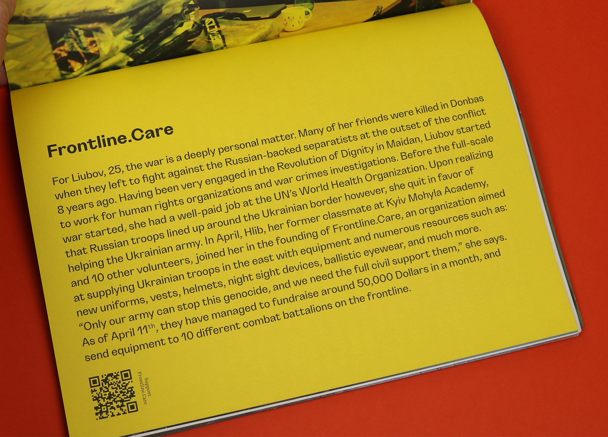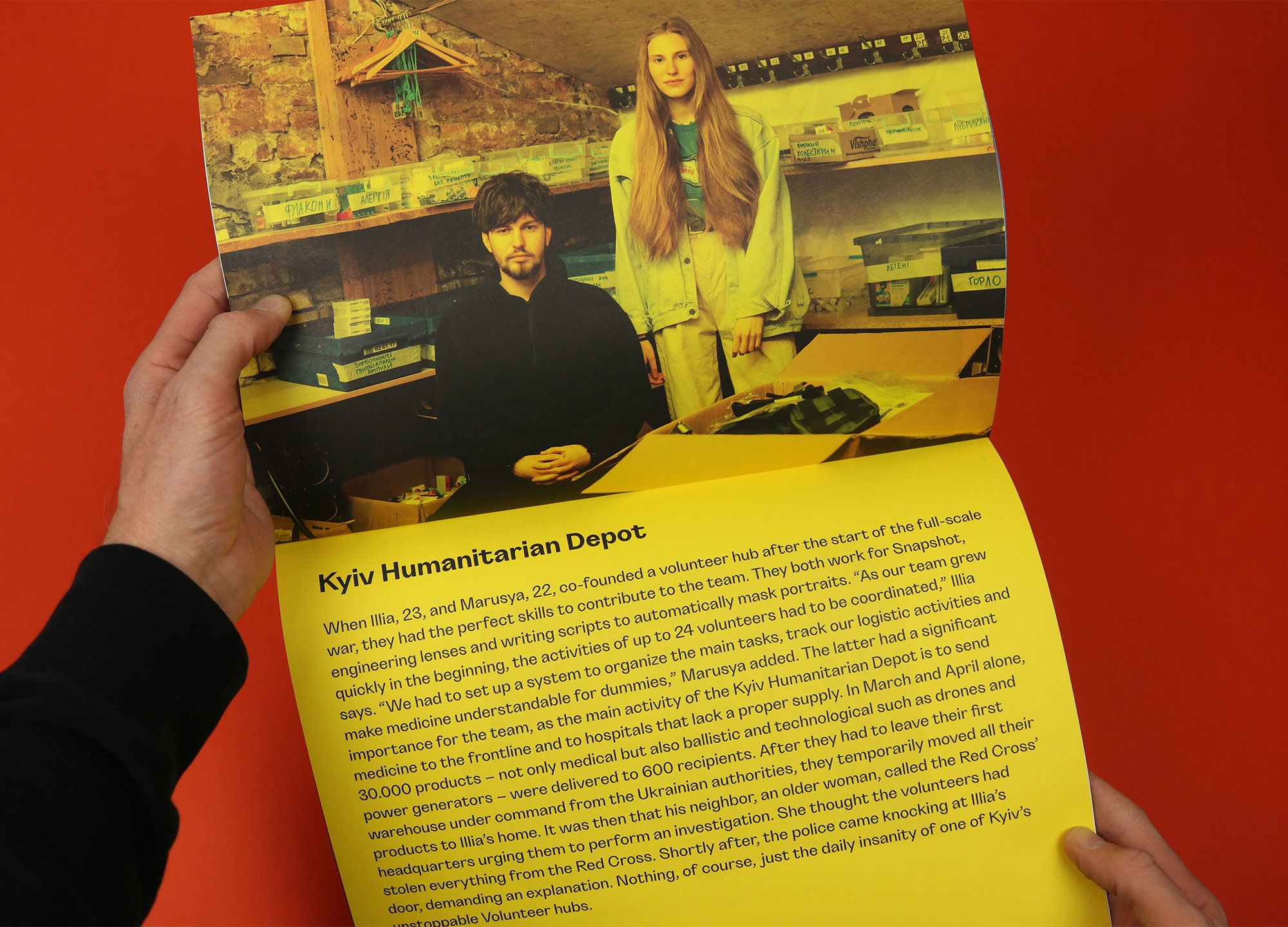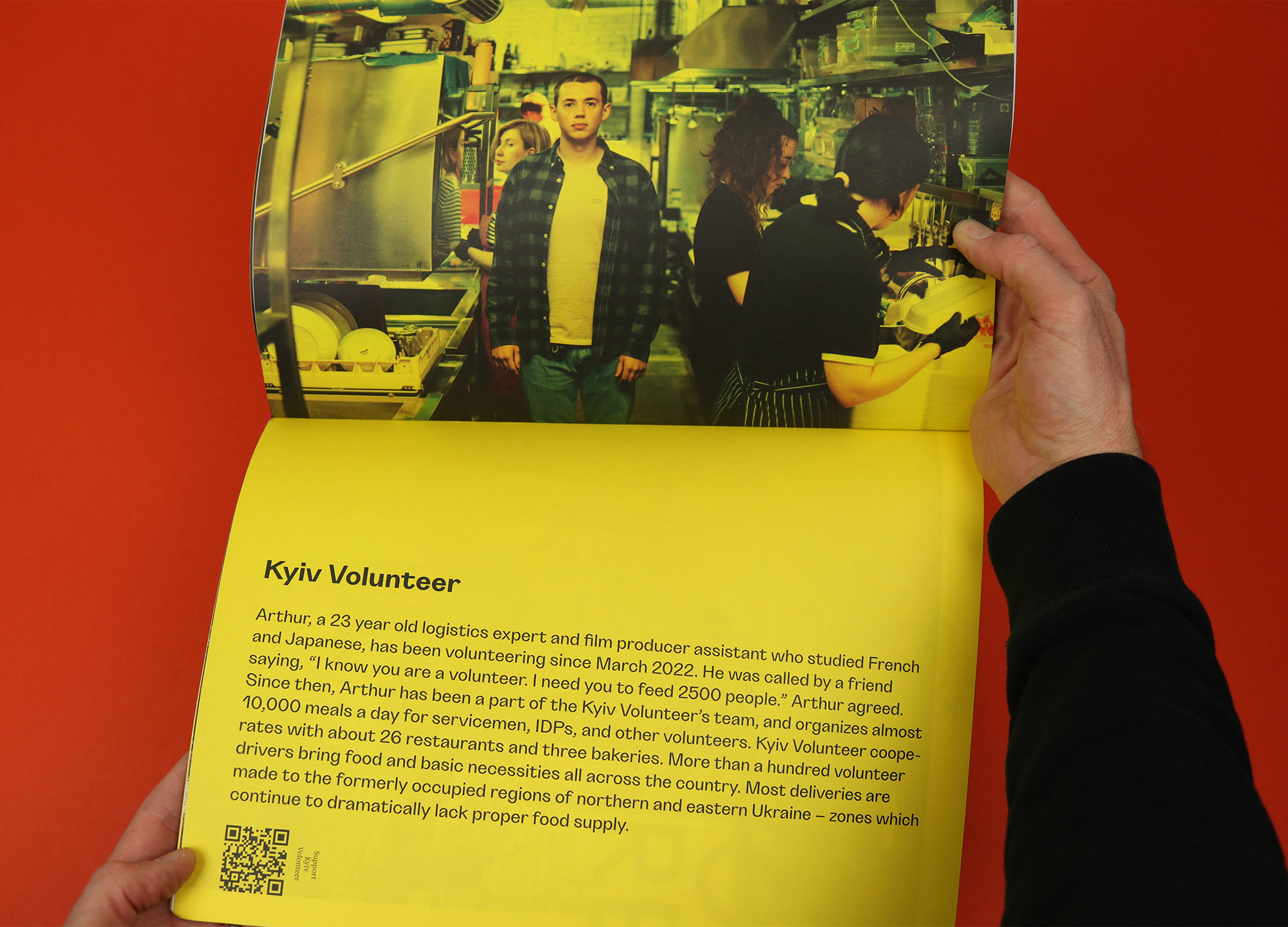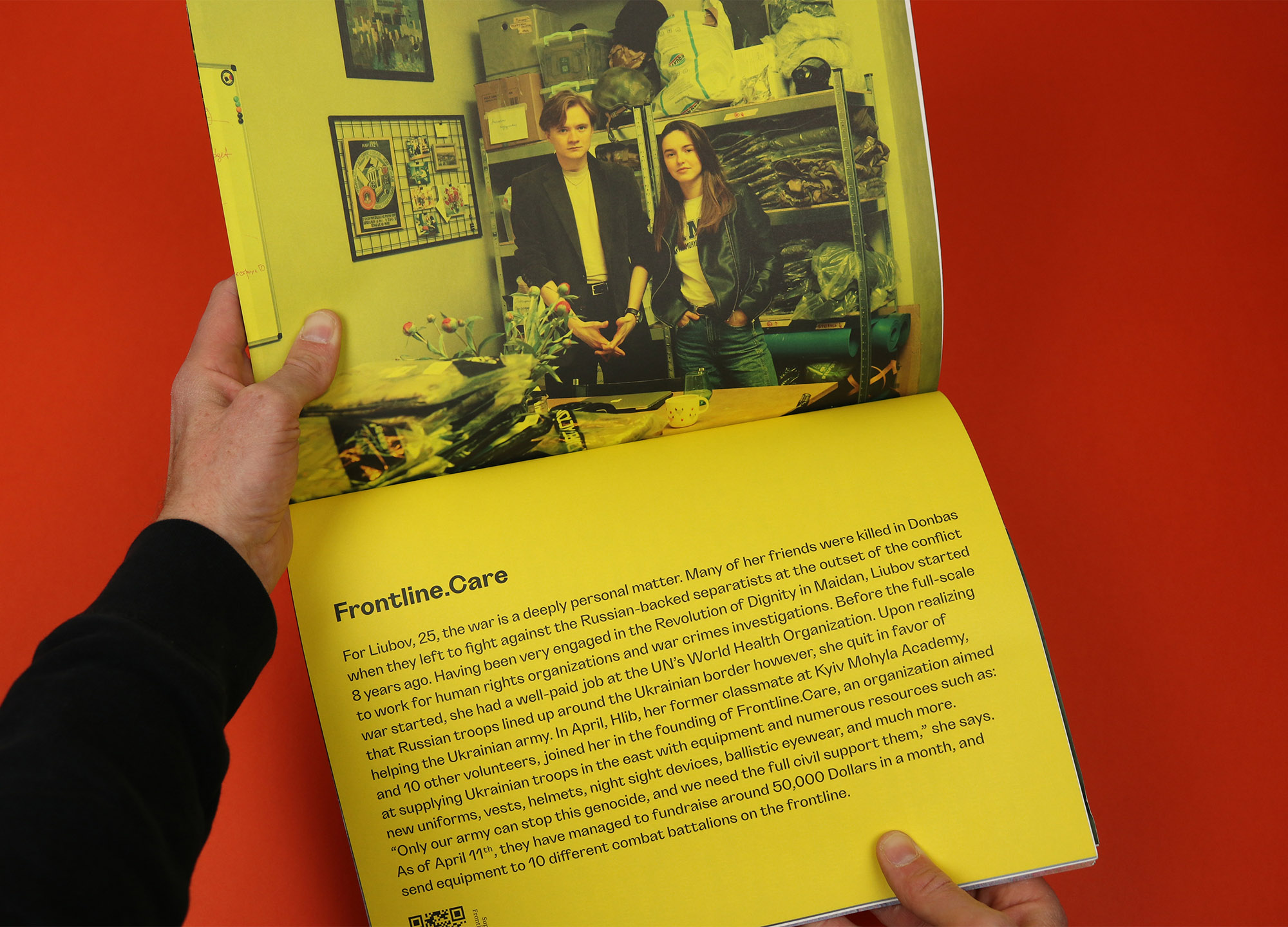 Separating them from the rest of the features gives them their own space and tone, and similarly a series of profiles is dotted through the magazine, detailing the work done by young volunteers in setting up organisations providing aid, relief and military supplies. The profiles are rotated 90 degrees and printed on a yellow background, helping them to feel brighter, lighter and more optimistic.