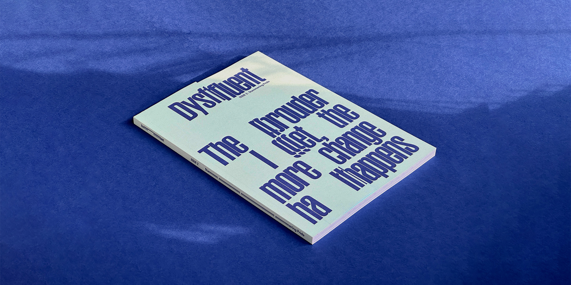 Conor Foran is editor of Dysfluent, a magazine that reflects his experience of stammering, and broadens that out to become a publication of stammering pride. It’s an interview-based magazine, and Conor uses it to speak with other people who stammer, as well as speech and language therapists, activists, and other people who have something to say about stammering. And it uses a custom typeface with letters that get stretched out, or chopped up and repeated, reflecting the sound of a stammer. All the interviews for the magazine are recorded and then carefully transcribed and typeset to represent that individual’s voice as closely as possible.