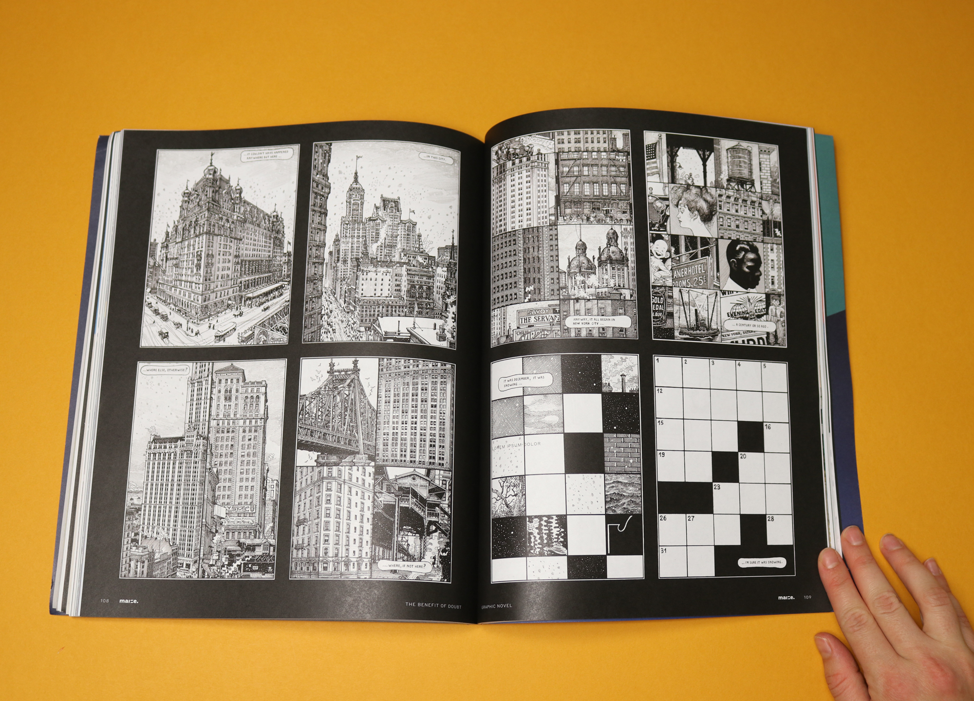 There are less and more engaging interpretations of this theme. Articles by business leaders (including the president and CEO of Yves Saint Laurent) offer relatively dry takes on the trials of decision making. More interesting are a series of left field contributions, including a double-page spread devoted to moments of doubt in cinema (eg. Sophie’s Choice), and a history of the crossword by Italian cartoonist Paolo Bacilieri, partly told in the form of a graphic novel.