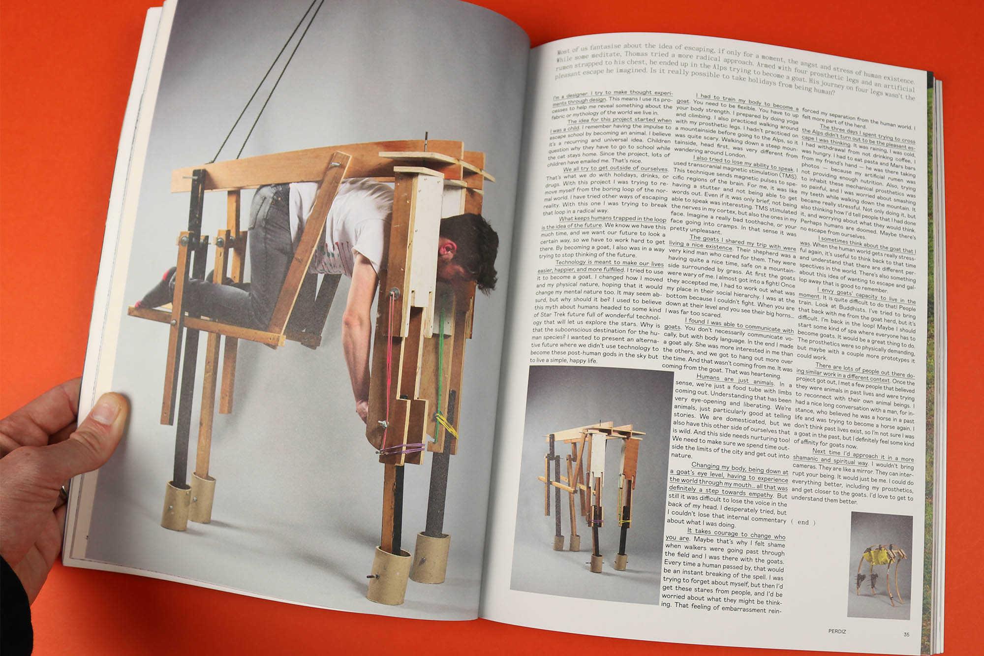 Perdiz is “a magazine about happiness”, and it’s full of strange people pursuing their own vision of whatever it is that makes them happy, often far away from their fellow humans. In the latest issue that includes Thomas Thwaites, the Londoner who built a prosthetic goat suit and spent three days in the Alps trying to bond with a herd. In his interview he concedes it was a difficult experience, in which he was cold, wet and hungry, and “worried about smashing my teeth while walking down the mountain.” But, he says, it was valuable nonetheless: “I sometimes think about the goat that I was. When the human world gets really stressful again, it’s useful to think back to that time and understand that there are different perspectives in the world.”