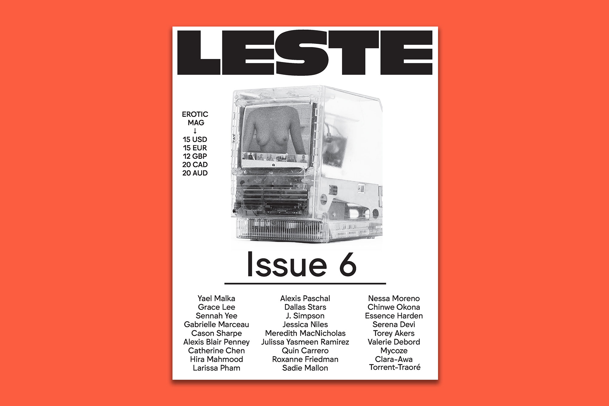 Printed in black and red, Leste comes in a clear plastic sleeve, giving it the alluring look of contraband. The magazine calls itself a biannual magazine of new erotica, but this sixth issue is something more challenging. The opening pieces are written by sex workers: one essay details the ways that police officers engage in sting operations; in some states in the US, officers actually go as far as having sex with women in order to arrest them. In the more personal piece that follows, a writer shares her surprisingly tender stories of seeing clients in a New York apartment. Read together, this is an impassioned call for the decriminalisation of sex work. With a glut of erotic mags on the market, Leste is an interesting reminder of the fact that writing about sex is, at its best, inherently political.