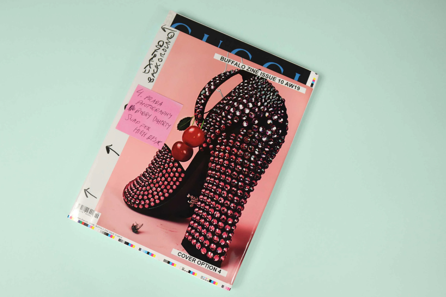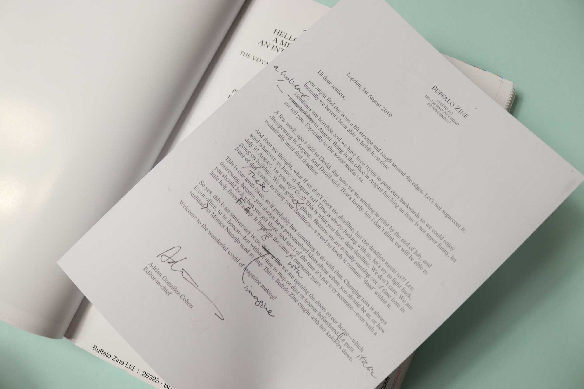 Satirical fashion magazine Buffalo rethinks its entire visual identity every issue; the ‘Holidays in Spain’ issue looks like a catalogue, and Buffalo’s latest, themed ‘Viral’, has been designed to look like a ring-binder. The size of the magazine, too, varies wildly between issues. Number 10 is perhaps Buffalo’s biggest ever. Themed ‘Unfinished’, the whole magazine is bound in what looks like white masking tape and speckled with post-it notes from the editors (the illusion is that this is a proof, of the kind Anne Hathaway was delivering Meryl Streep to sign off in The Devil Wears Prada). One of the most ridiculous features in this wonderful magazine is a “rare interview” with Angela Merkel, before she heads off “to her usual Summer holiday in South Tyrol”. The interview didn’t actually happen (no time?), so instead we are given 11 enormous blank pages and some Lorem Ipsum dummy text.