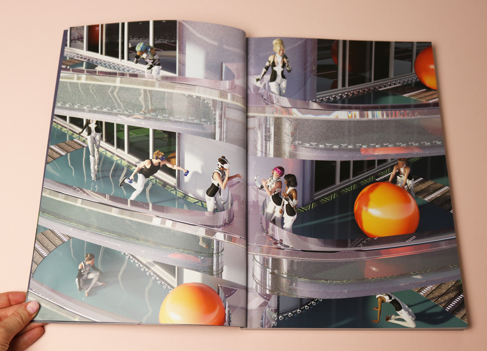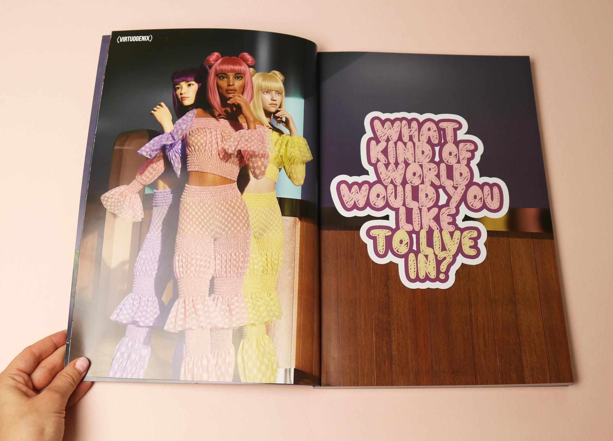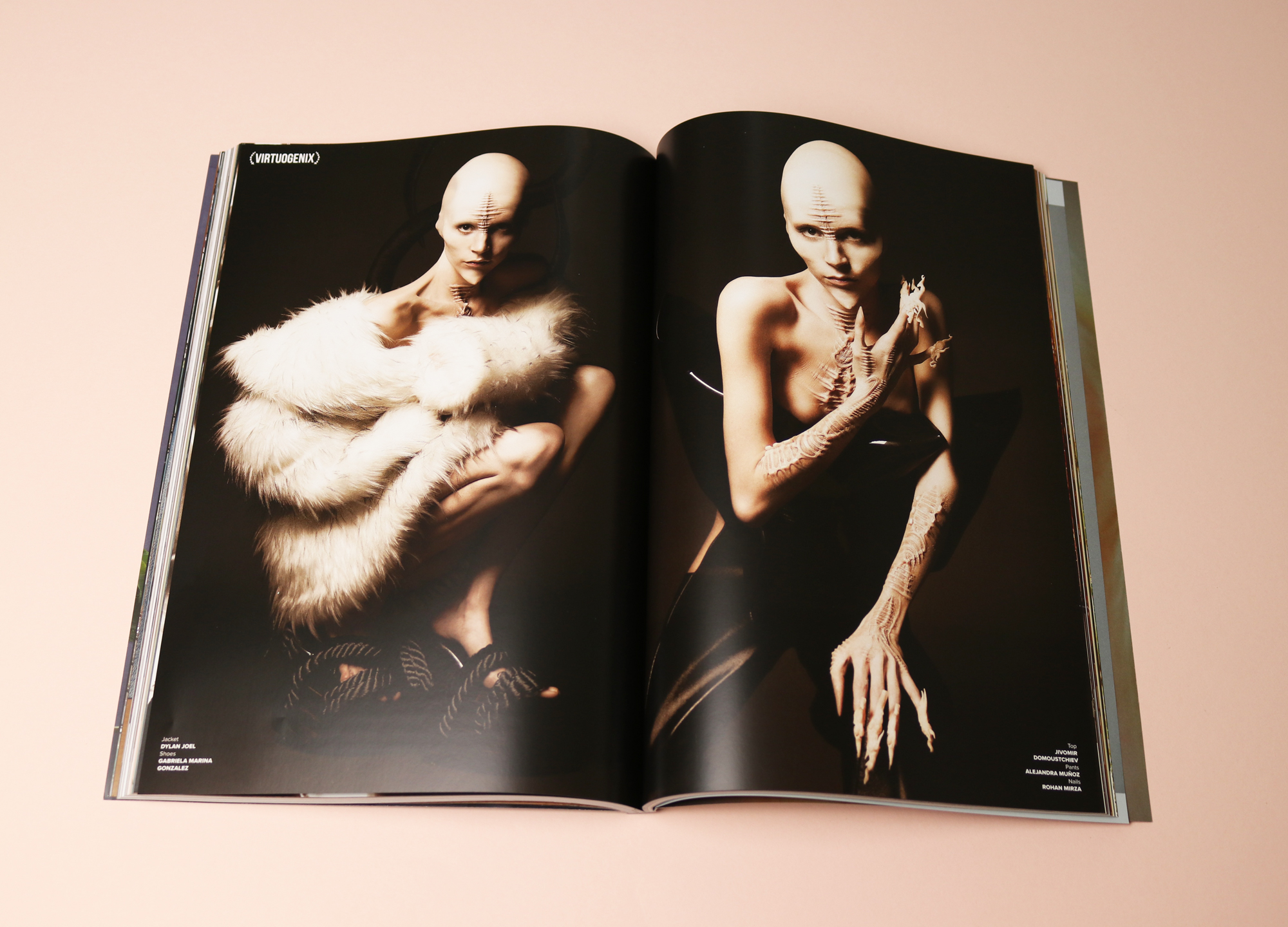 Virtuogenix is a deliberately repellent fashion magazine, featuring lots of non-human models. Taglined “where fine art meets fashion”, in its best shoots, Virtuogenix creates whole alternative worlds designed to pastiche conventional femininity. We see impossibly beautiful computerised women wearing eerie gas masks, while other sims hoover while simultaneously doing ballet. The large-scale format makes the through-the-looking-glass effect all the more immersive.