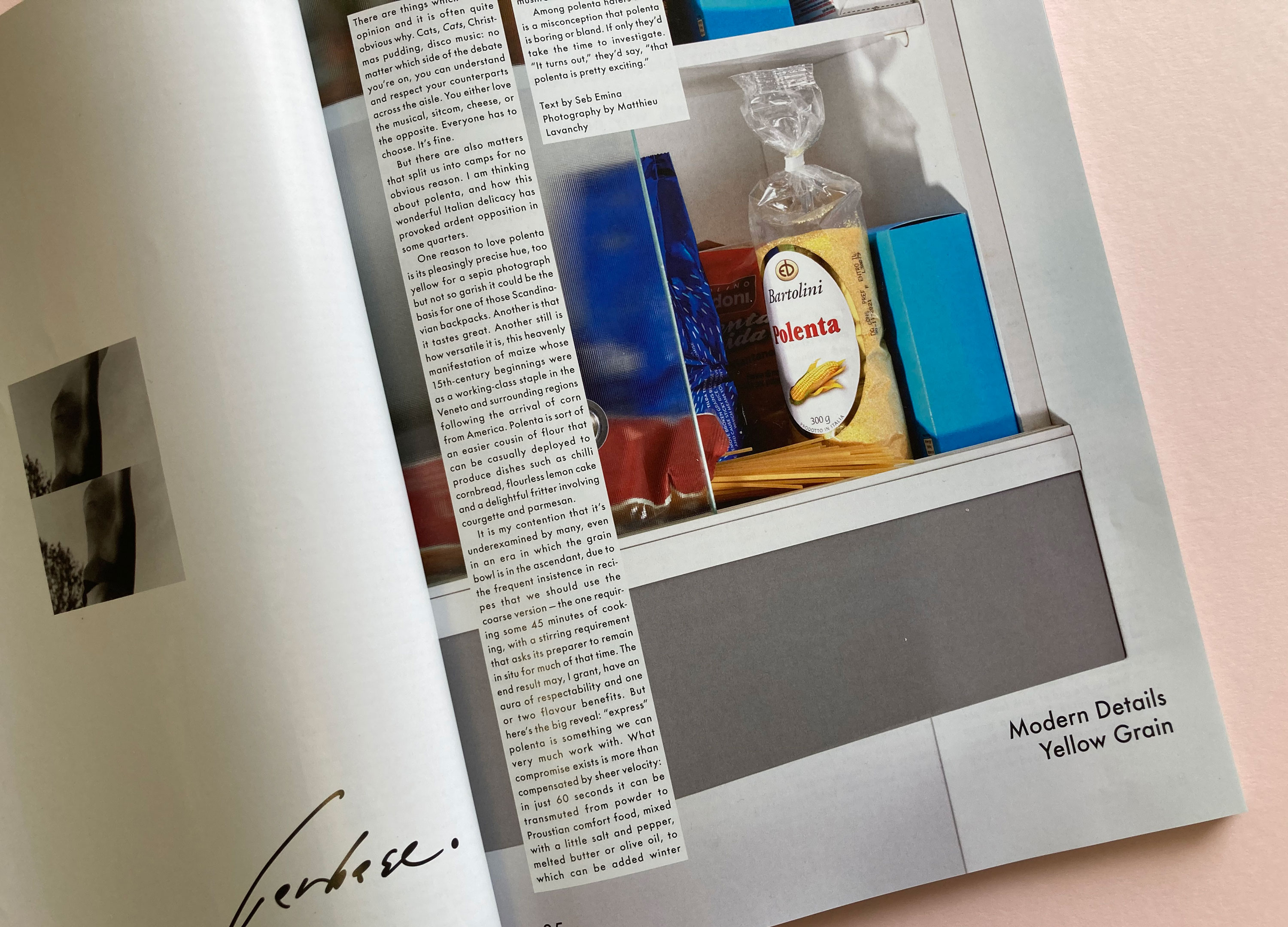 One long-standing feature of The Gentlewoman is its Modern Details column: a writer (always a very good one) is given an object — a purse, a kitchen gadget, a neckerchief, or a foodstuff — and 200 words to play with. The language is antiquated, almost courtly in style; take this line, by Seb Emina, about a bag of polenta: “It is my contention that it’s overexamined by many, even in an era in which the grain bowl is in the ascendent”.