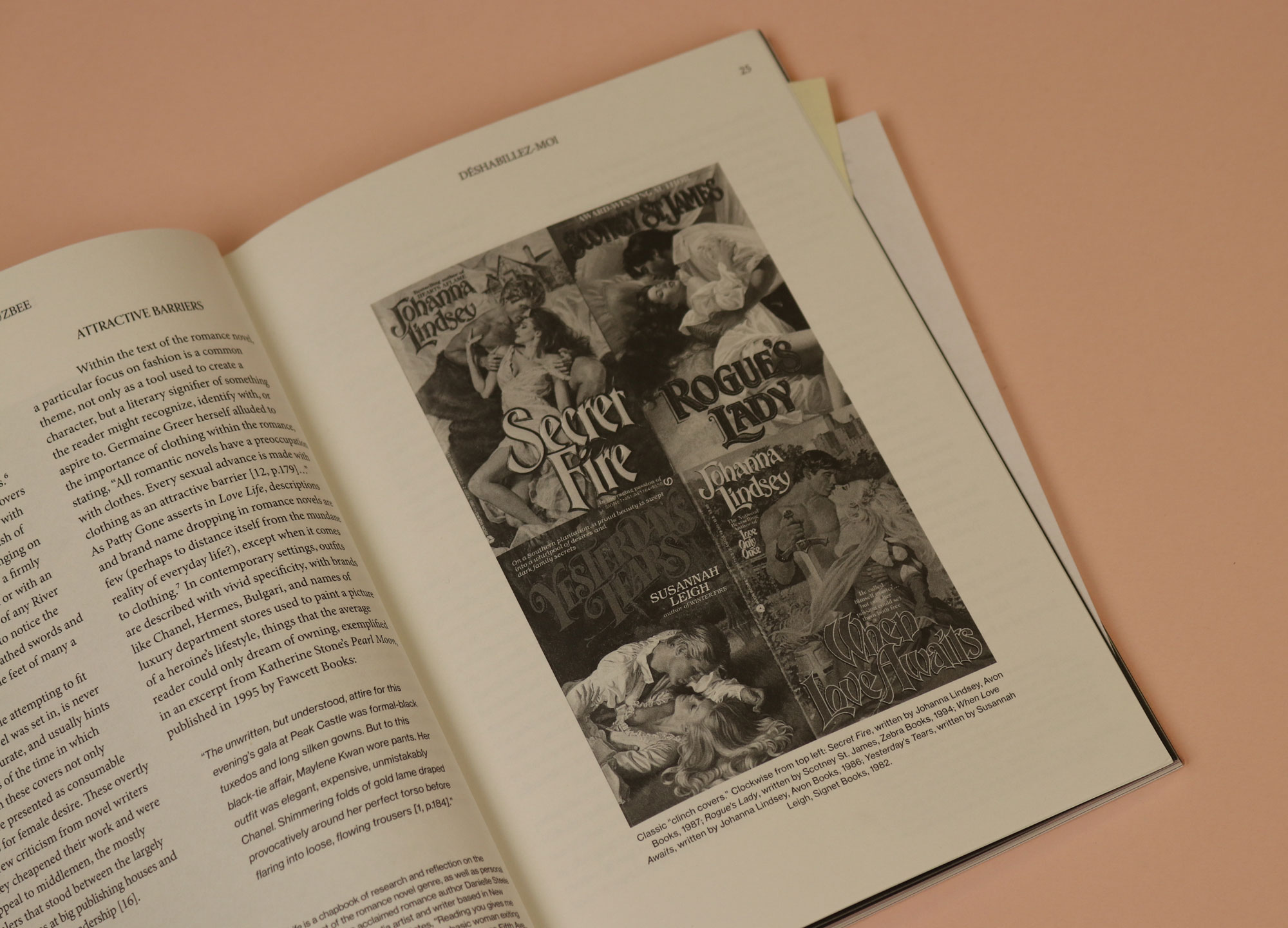 This essay, by Buzbee, unpicks the ways that the romance novel’s concern with fashion has informed ideas of what a woman should be. One great spread features racy eighties book covers, where the women are all pictured lying down, and the men are all gripping massive, unsheathed swords. Buzbee is concerned with the doubleness of the genre — the way that romance novels can be seen as patriarchal and constricting, but at the same time, the very act of reading one is a kind of assertion of independence; a dedication on the part of the reader to an unrestricted fantasy life; to read what she likes. Buzbee quotes the American scholar Janice Radway: