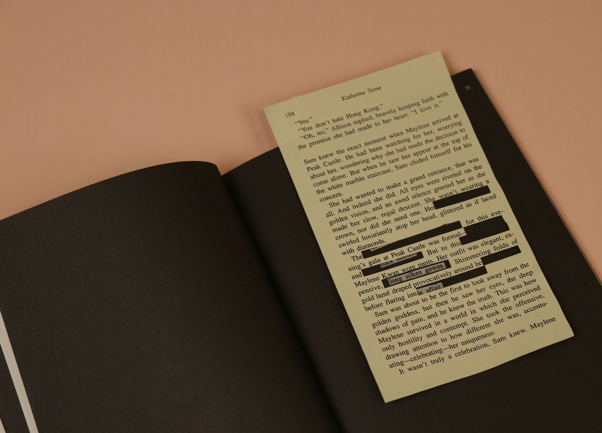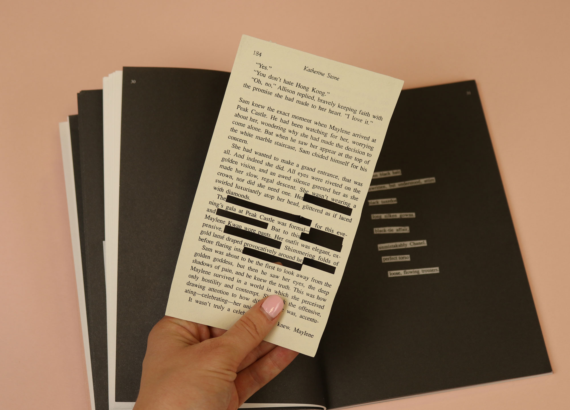 The writing in Novella is thoughtful and rich, but it is the design of this magazine that is the real delight. Interspersed throughout are pages from ‘Pearl Moon’, a romance novel by Katherine Stone. The pages are loose, and certain words have been cut out by hand, and printed on the page behind. The story becomes a kind of jigsaw puzzle: you have to move the page around to fit the gap to the correct word. In this way, the act of reading is transformed into something satisfyingly secret and intimate — which, I suppose, is what a well-plotted romance novel is all about.