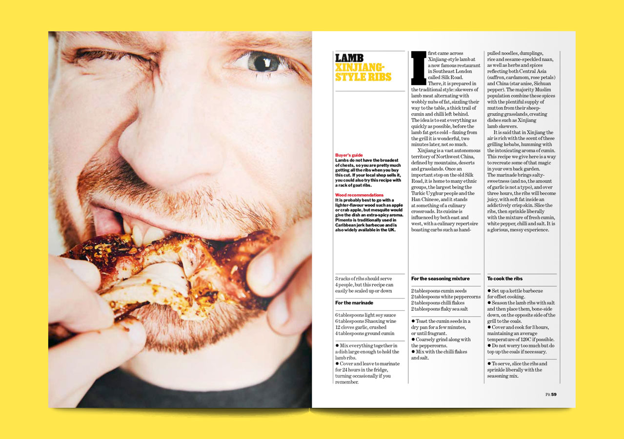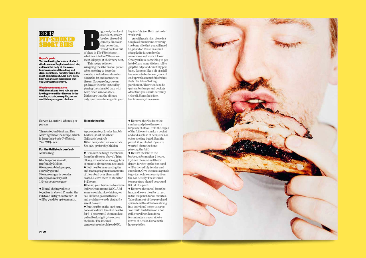Holly: I hate an artfully placed napkin and some herbs and seeds just scattered on the table. Who does that? It just feels lazy to me. I like a crazy over-styled look for food. When the food is super close-up or photographed against a really bright background. I’d much rather publish something really over the top and weird than scatter some pointless ingredients around a table. I think my favourite shoot we’ve ever done is still the one from issue one, with people eating ribs to illustrate different rib recipes. Mainstream food magazines rarely actually show people really eating: lots of people think it doesn’t look very good. Even ours had a fair amount of retouching to make the teeth look nice. One person even had new teeth drawn in, but I won’t tell you who.
