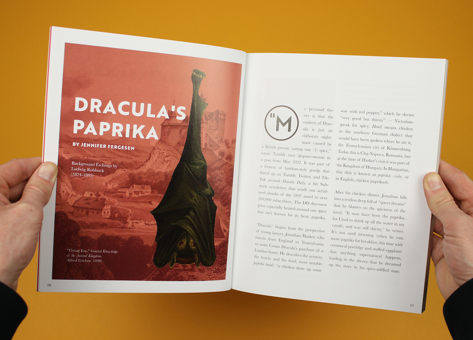 A magazine of food history, each issue of Eaten takes a different theme as a way of digging down into subjects like ‘Salty’, ‘Processed’, and ‘Breakfast’. The latest one focuses on ‘Spicy’, with stories on the fieriness of chillis, and the British origins of curry powder, but my favourite article in the magazine considers the history of paprika and includes the theory that, “the entirety of Dracula is just an elaborate nightmare caused by a British person tasting one (1) spice”. The theory revolves around Jonathan Harker arriving in Transylvania and eating a spicy chicken dish before falling into, “a restless sleep full of ‘queer dreams’ that he blames on the spiciness of the meal.” Of course the theory doesn’t do much to elaborate on Bram Stoker’s masterpiece, but it’s full of fascinating reflections on the creation of paprika and its uses over the years. One of my favourite things about Eaten is its use of vintage illustrations and artworks throughout, with collaged photographs, paintings, drawings and etchings used alongside its historical musings.