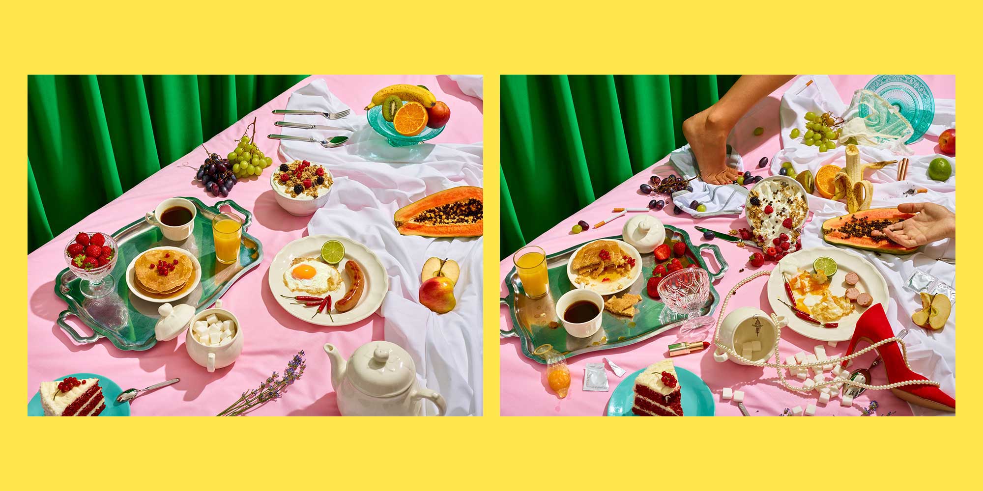 The highpoint is Morgenmete’s Sex For Breakfast shoot. Opening with two luxurious table spreads, entitled ‘Before sex/ After sex’. The images are lush, and absurd — creative director Tim Lampe’s influences are Aleksandra Kingo and the duo behind Toiletpaper magazine, Maurizio Cattelan and Pierpaolo Ferrari.