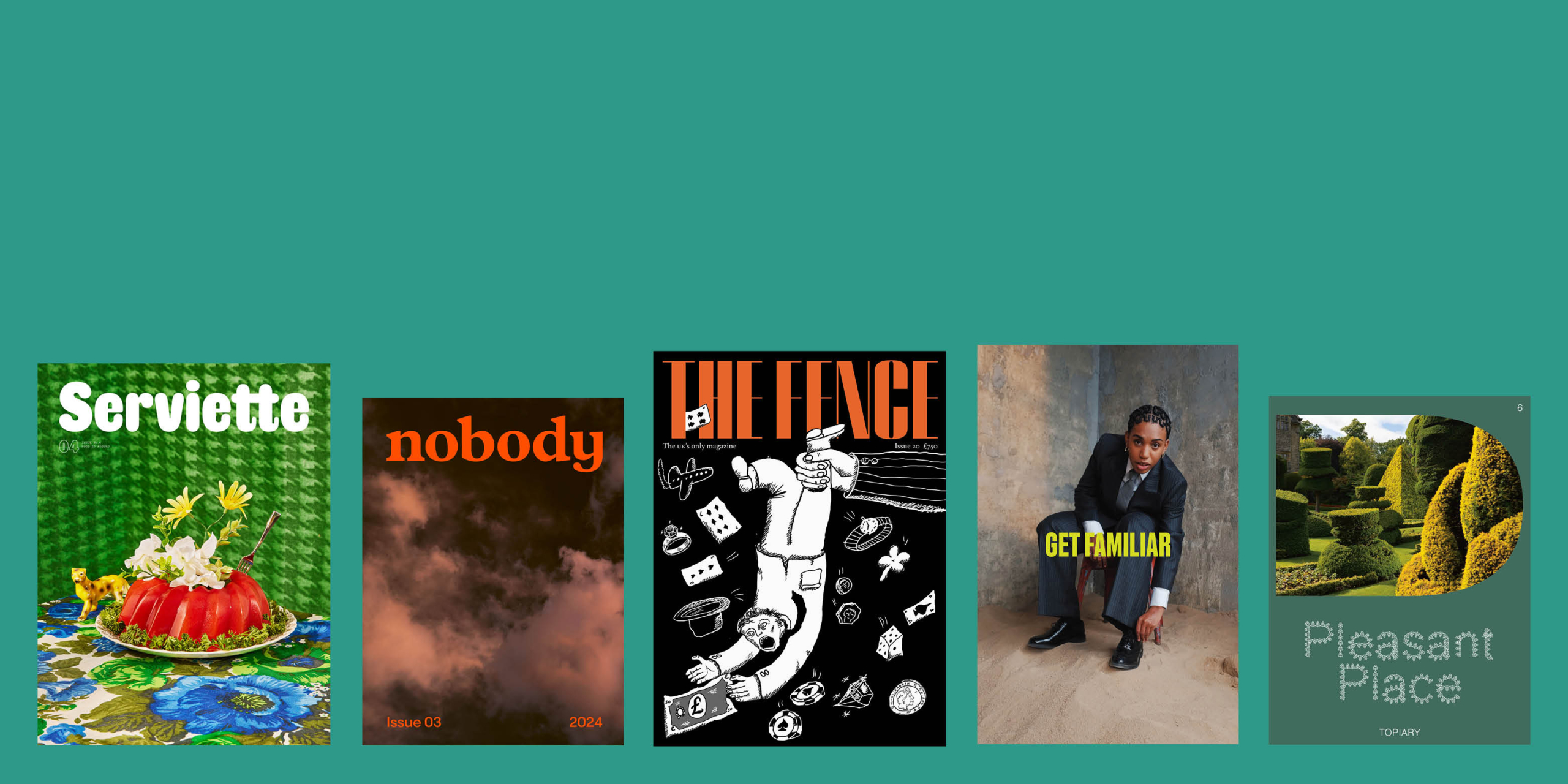 Listening back to the episode I’m struck by the variety across the selection. That’s partly down to the subject matter – the five magazines featured in this episode cover an eclectic range, including food, music, and gardening. But more importantly, the motivations behind publishing these magazines are all totally different, and I think that comes across in the small chunks of audio, giving a nice taste of what makes these creative projects so special. In order, you’ll hear from Serviette, Nobody, The Fence, Get Familiar and Pleasant Place.