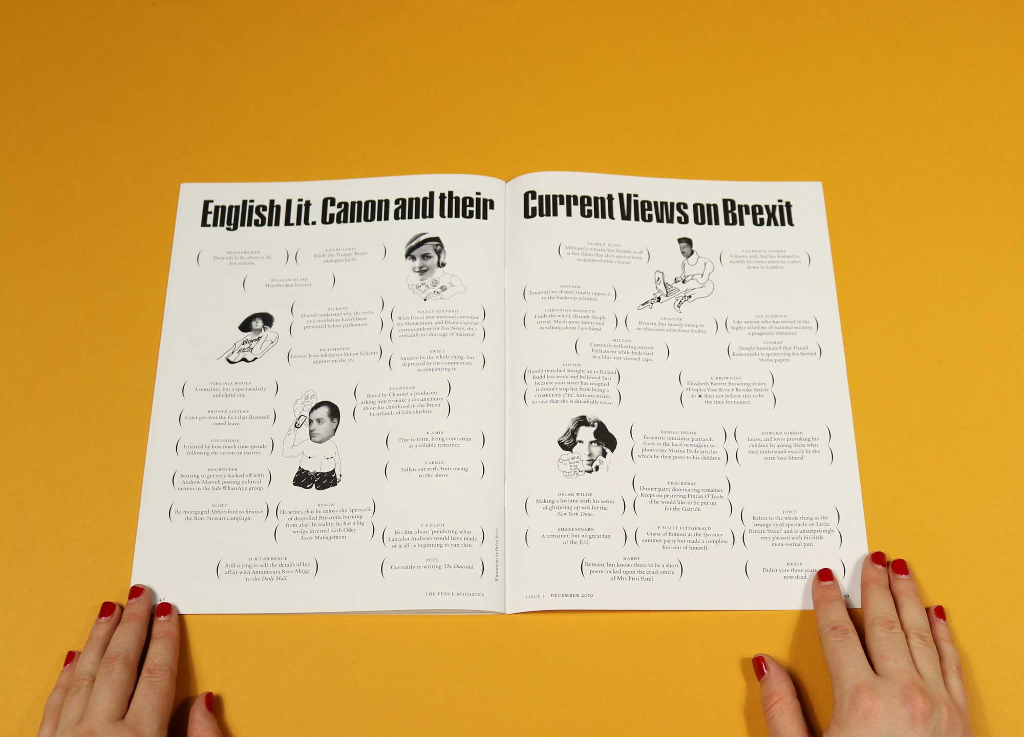 As editor, I wanted to organise the magazine into four different areas. Firstly, I wanted columns by named writers such as Séamas O’Reilly, who writes as Flann O’Brien, our Westminster correspondent, doing away with the complete anonymity of Issue 0. I also wanted a tighter focus on literary satire, such as the Sally Rooney piece and ‘The Literary Canon’s views on Brexit’, as well as including fiction such as Tamara Colchester’s woebegone therapist. And pieces from insiders spilling the beans — like our anonymous chef who reviews food critics, only serving up hatchet jobs. I’ve also got an insider account of working at Newsnight from a young female producer coming in for the next issue. I also wanted more women working on the magazine, which we’ve achieved — we outnumber men is this issue.