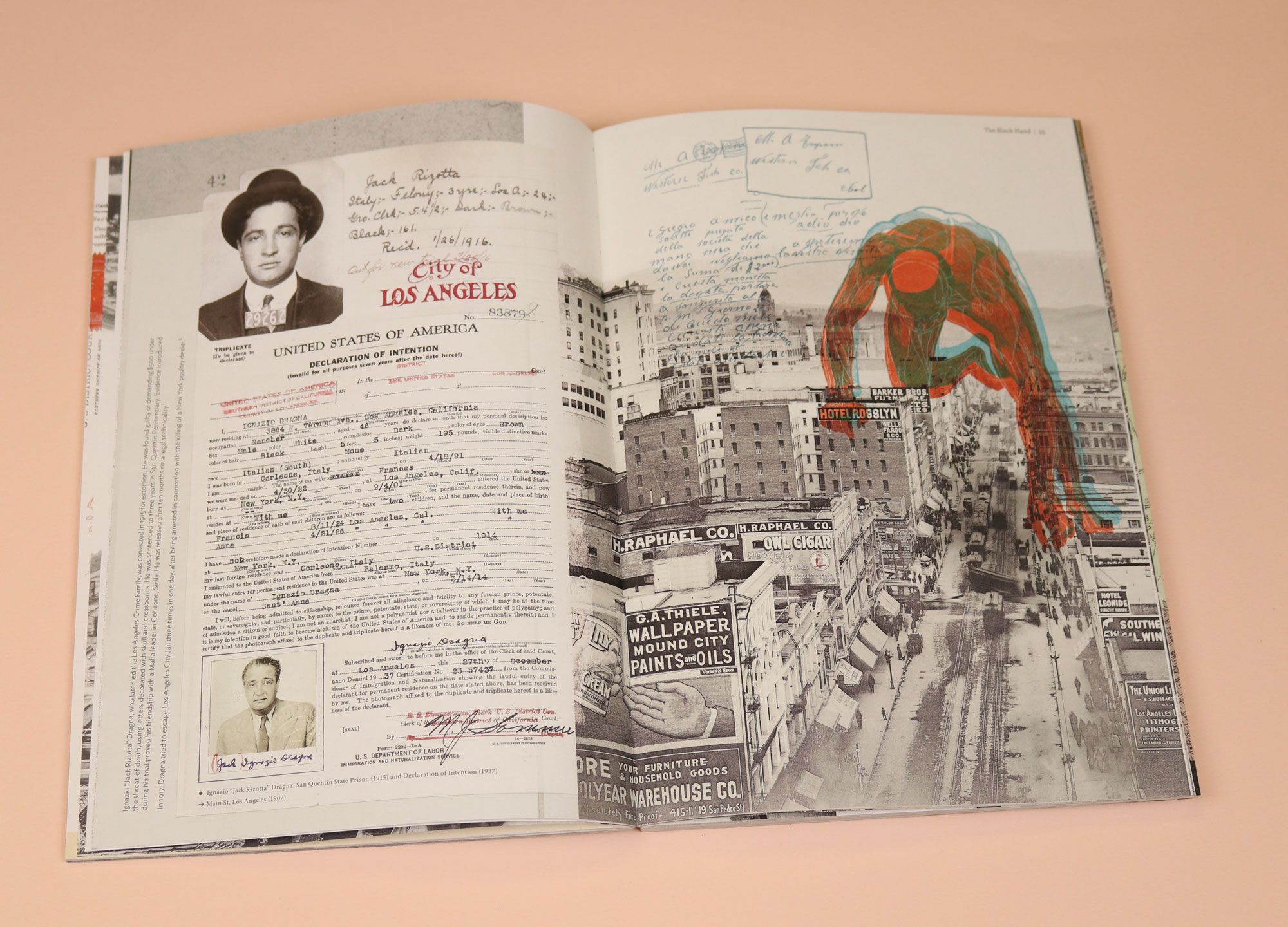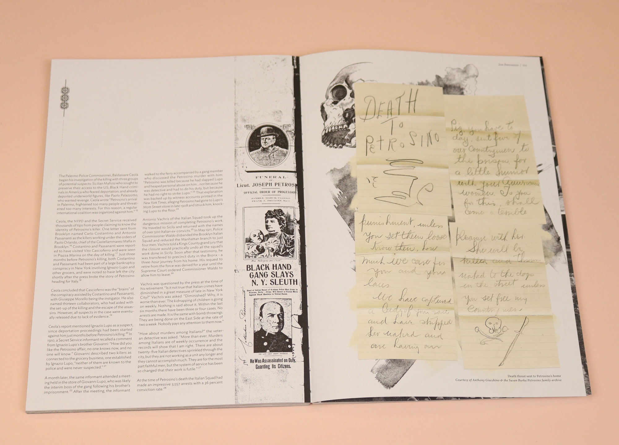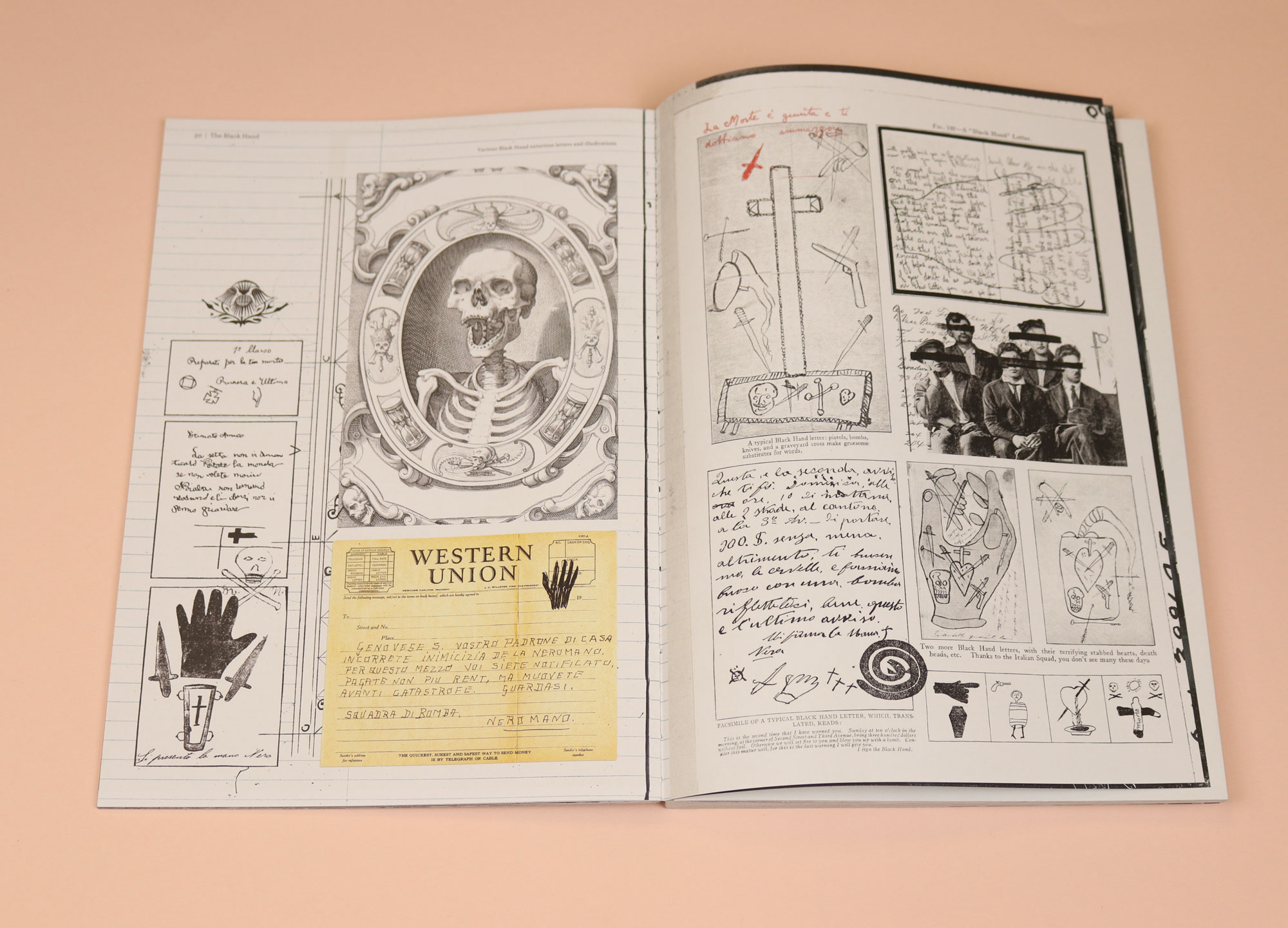 So meticulously researched it reads like a life’s work, Secret Societies examines the origins of the Sicilian-American Mafia in the largely undocumented period from the 1890s to the 1920s. Illustrations work in conjunction with photography in this magazine with drawings layered, intricately, over archive photography. Most fascinating of all are pages of ‘Black Hand Letters’, that were shoved through the crack under a door or dropped in a tenement letterbox, containing a demand for money under threat of death. The letters were hand-written and illustrated. Reprinted here, the drawings themselves are powerfully immediate; you get a visceral sense of a frighteningly personalised, menacing gang culture. There are skulls, and guns, and — most unsettlingly of all — a line drawing of a ghostly hand-pencilled over a death threat.
