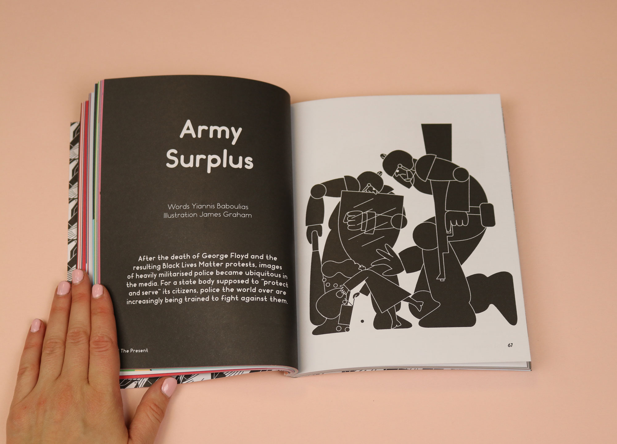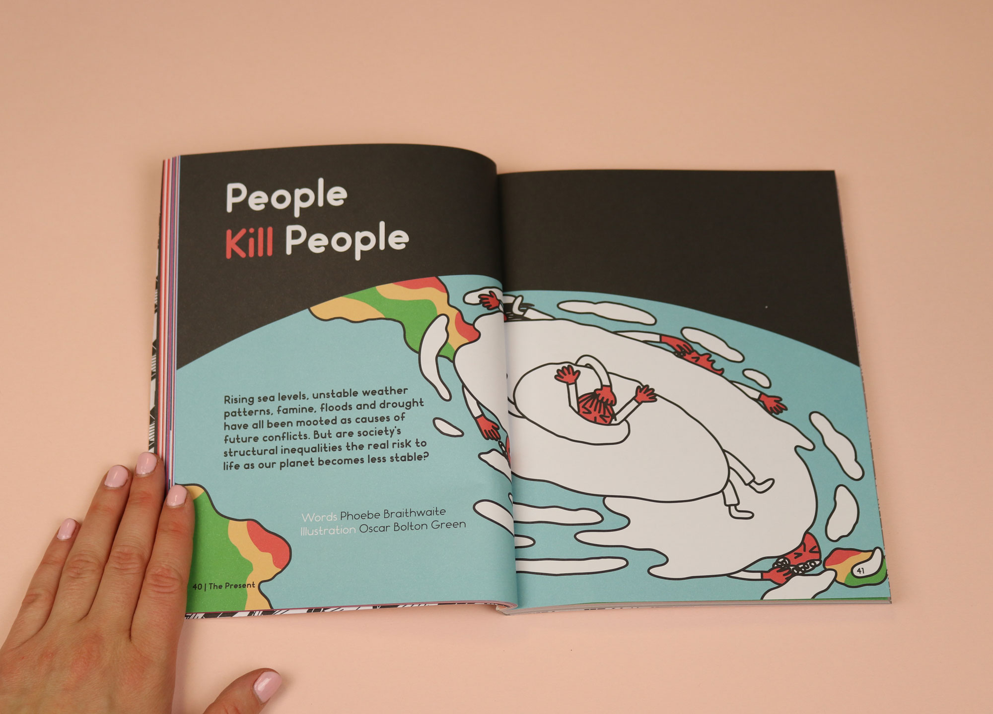 Founded in 2013 with the explicit aim of changing the world, the magazine’s use of illustration is what stops that aim feeling lofty and inaccessible. Focusing on a different global challenge per issue, the magazine uses bold illustration to illuminate difficult topics, including food, megacities, inequality, and power. The latest issue is themed ‘war games’ and stand-outs include a strikingly simple, cartoon-like rendering of two police officers towering over a woman, which accompanies a piece about police brutality. Another brilliant illustration, by Ari Liloan, sits next to a piece about the British Empire. It shows red, eerily disembodied hands, trying to claw their way out of a crown.