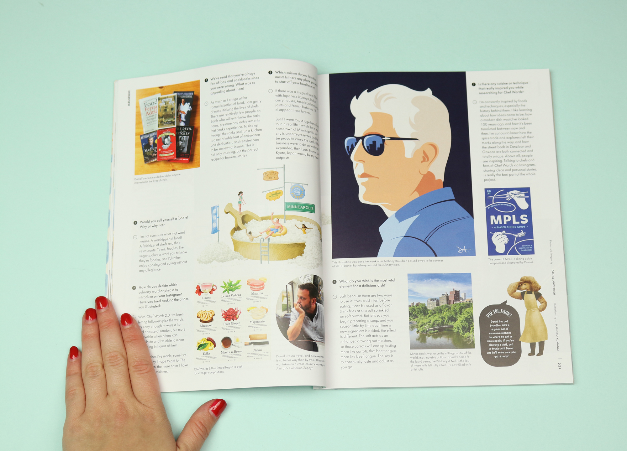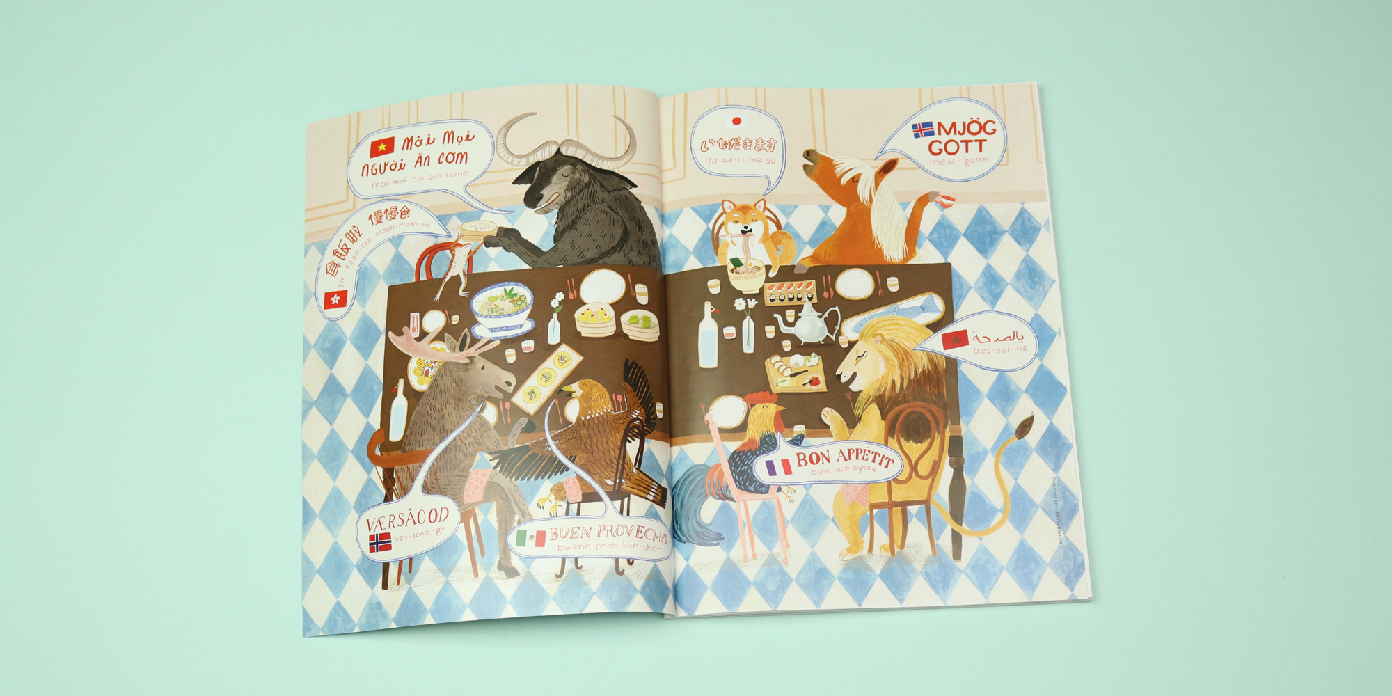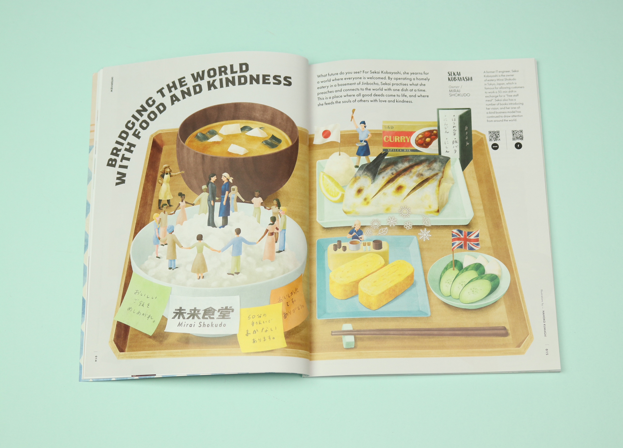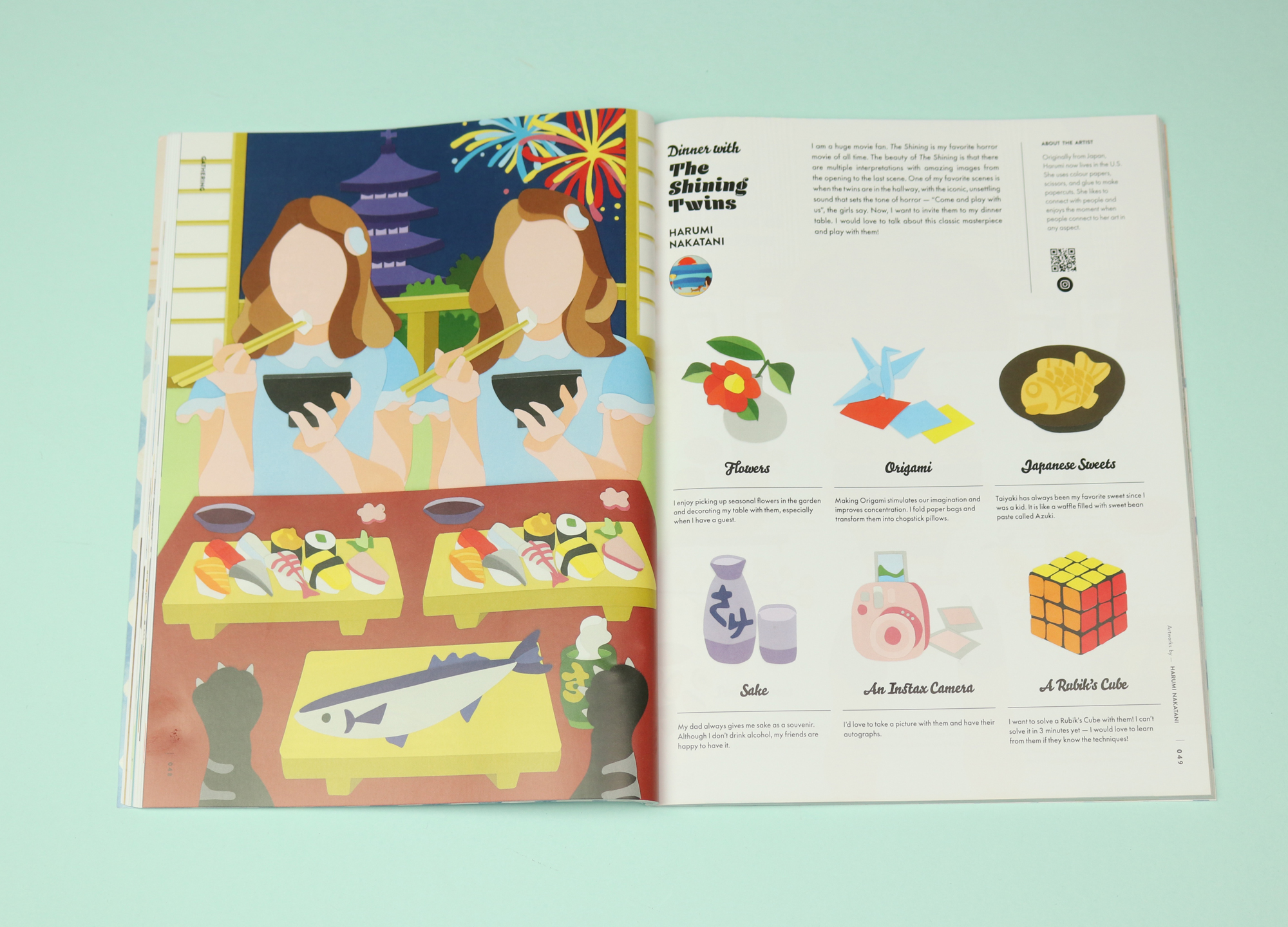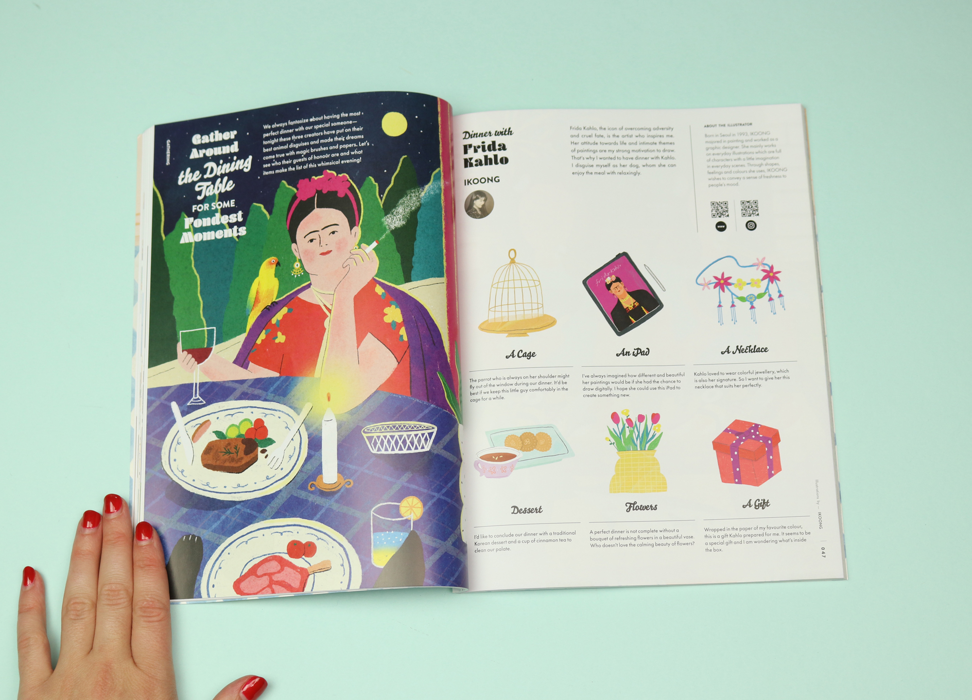 Issue five is themed around food, and one great feature invites illustrators to draw which celebrity they would most like to have dinner with. The twist is that the illustrators have to imaginatively undergo the dinner in animal-form, not as humans. The illustrator Ikoong, for example, draws herself having supper with Frida Kahlo: “I disguise myself as her dog, whom she can enjoy the meal with relaxingly.” The artist Harumi Nakatani draws herself as a cat, having supper with the twins from The Shining.