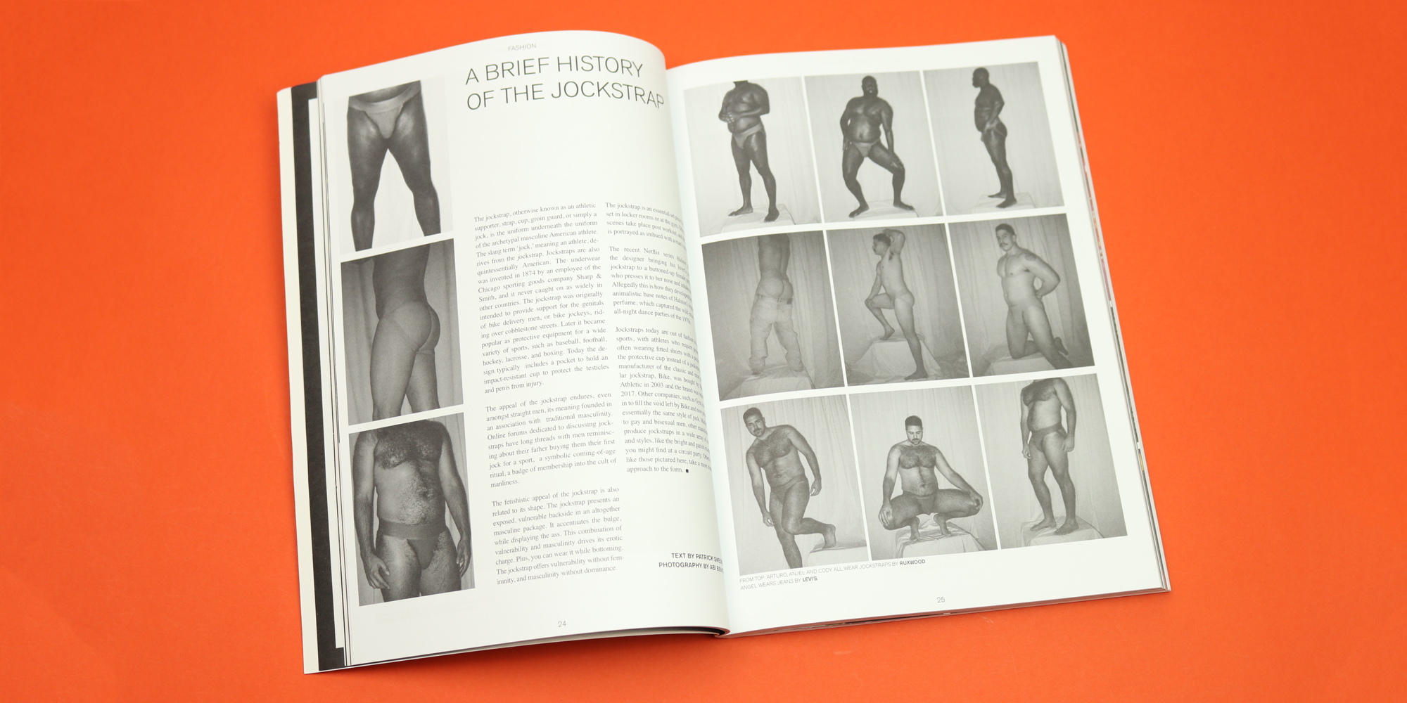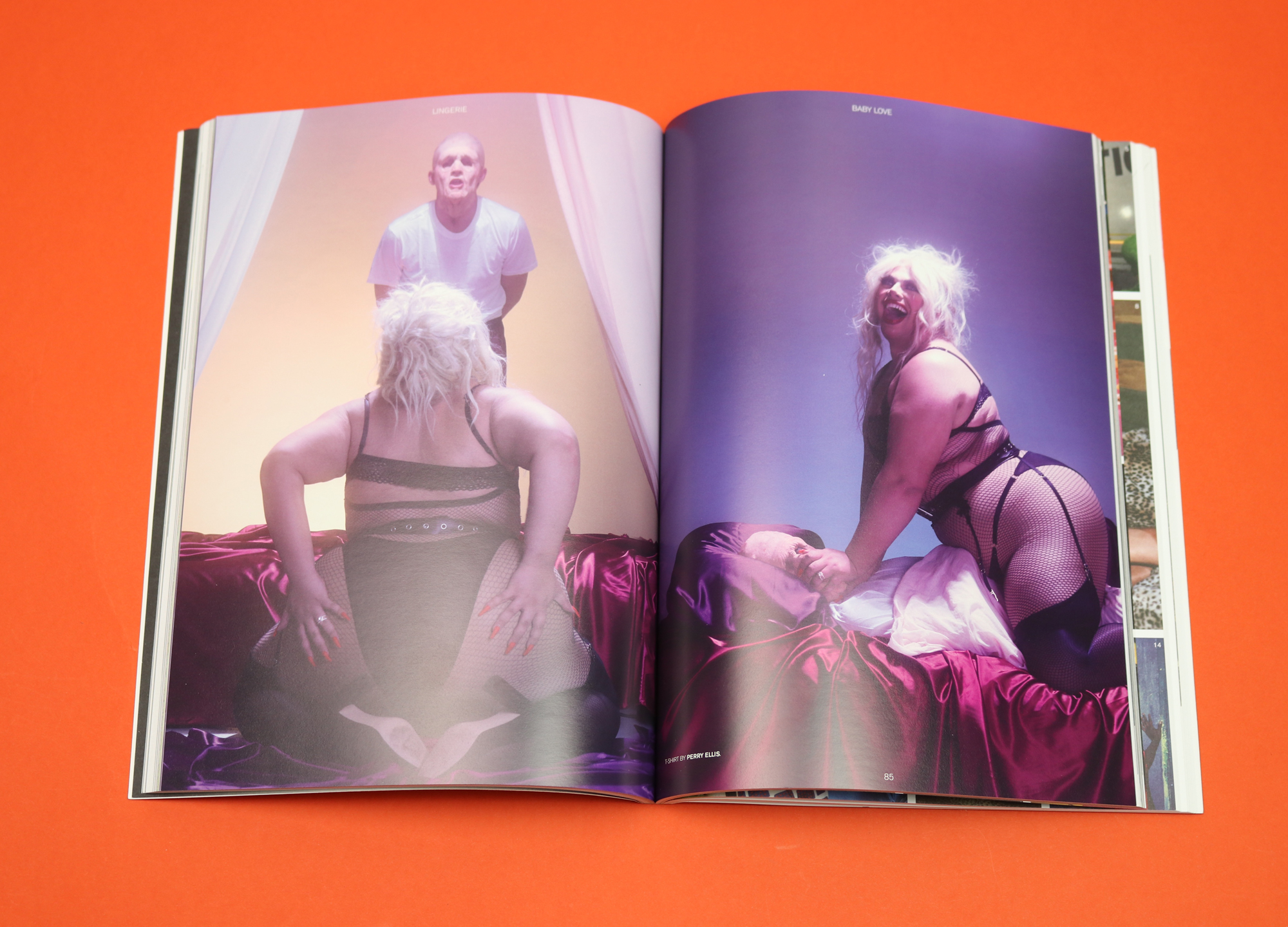 Part of what makes Gayletter such a pleasure to read is that it has a sense of humour. One delightful feature in here offers A Brief History of The Jockstrap – taking care to mention the moment in the mid 70s when the designer Roy Halston Frowick took his lover’s sweaty jockstrap to a perfumier (apparently this is how the feral, animalistic notes in Halston’s legendary perfume was developed). There is also a fabulous underwear shoot with drag queen Baby Love; one image shows her smothering a zombie lover.