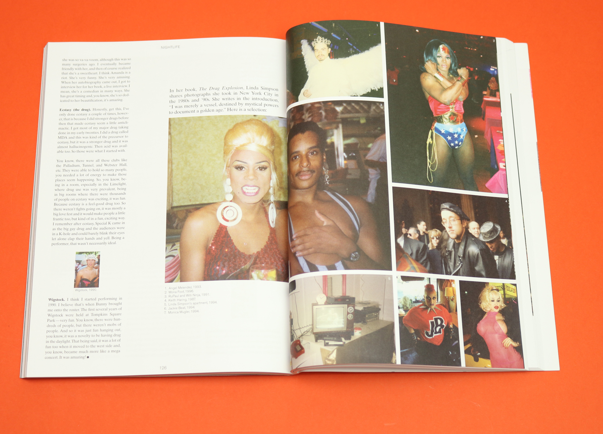 Gayletter started out as a newsletter in 2009, providing a highly selective guide to New York gay culture. In this fourteenth issue, editors Abi Benitez and Tom Jackson take readers back in time via an interview with legendary drag queen Linda Simpson, a linchpin of the 80s downtown queer scene. Collage spreads of Linda’s own photographs accompany the feature, showing fabulously glitzy, grainy shots of RuPaul and Lady Bunny, Amanda Lepore and Joey Arias.