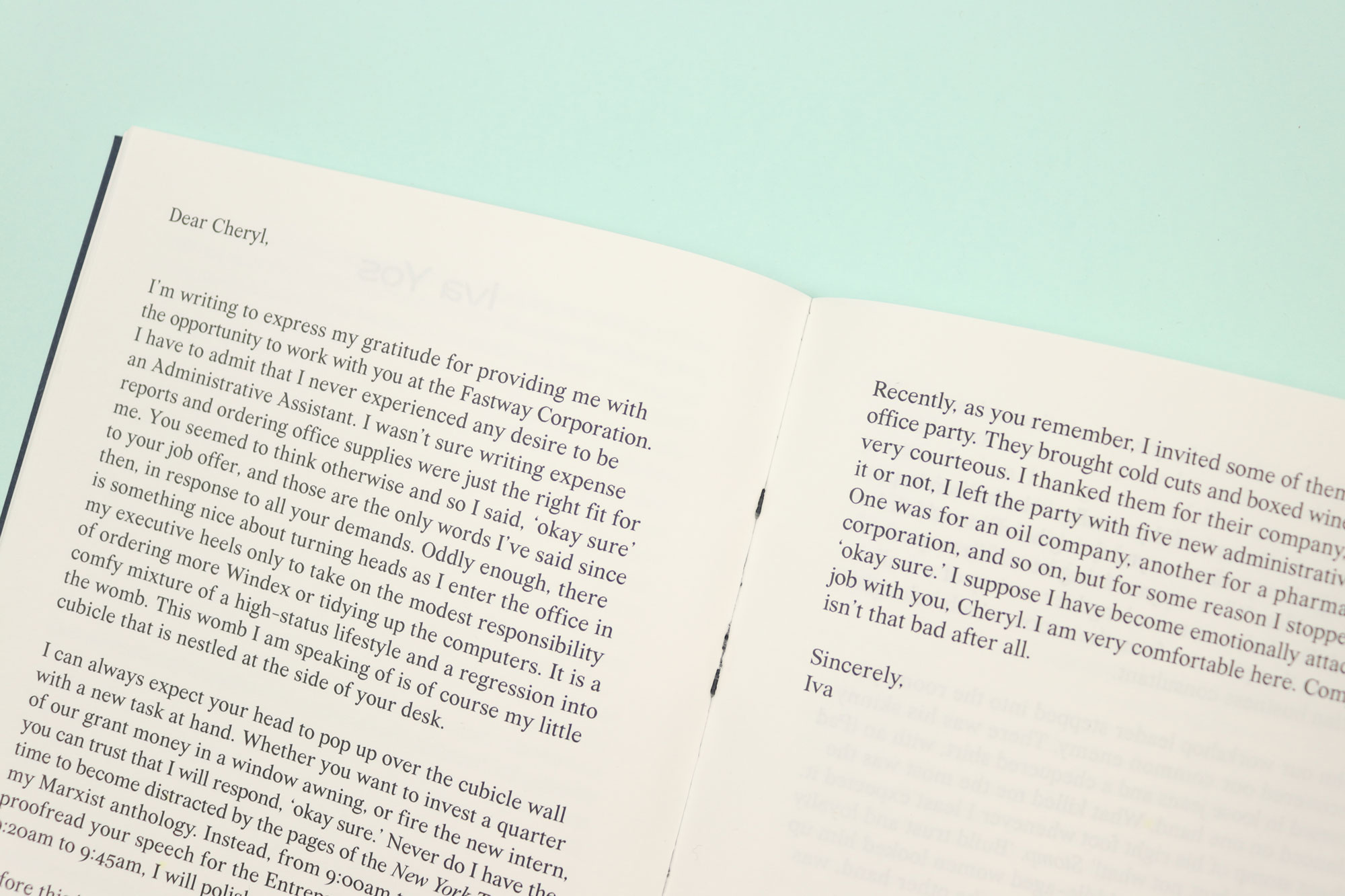 Another highlight is a letter from ‘Iva’, to her boss ‘Cheryl’, which includes the fantastically passive aggressive job description: “It is a comfy mixture of high-status lifestyle and regression to the womb. The womb I am speaking of is of course my little cubicle that is nestled at the side of your desk.”