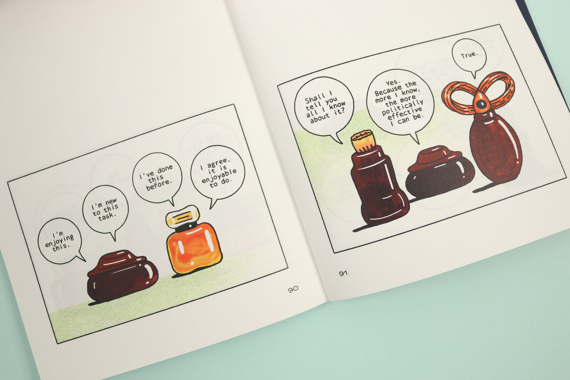 Neat and small, Ossian is unusually pretty. Most of the magazine is image-free, but it’s textually interesting, with credits spiralling across the page. Right at the end, there’s a comic strip: animated perfume bottles illustrating the Principles of Democratic Structuring. That sounds pretentiously academic, but it’s tongue in cheek. A bit like the cover-line: “Oh ye bards of future times”.