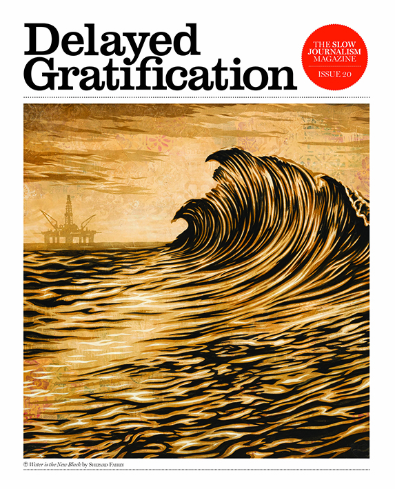 Delayed Gratification is proud to be ‘Last to Breaking News’. We go back to events that were picked up then quickly forgotten by the rest of the news media and tell the story in full, with the benefit of hindsight. We mix longer-form reportage and investigative pieces with beautiful infographics that draw out the patterns of the last three months and almanac-style write-ups on stories you may have missed. Every cover features work by an artist we love – issue one was by Shepard Fairey, the artist who created the Obama ‘Hope’ poster, and issue two was an original piece by Iraqi calligrapher Hassan Massoudy.