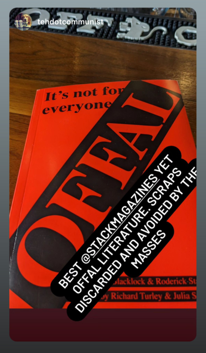 Offal is an independent journal of literary and artistic offcuts, celebrating and shedding new light on the leftovers, scraps and experiments of the creative process. Offal is also a cult AI-voiced comedy/literature radio show, or ‘audio zine’, both drawing on and adding to the publication.