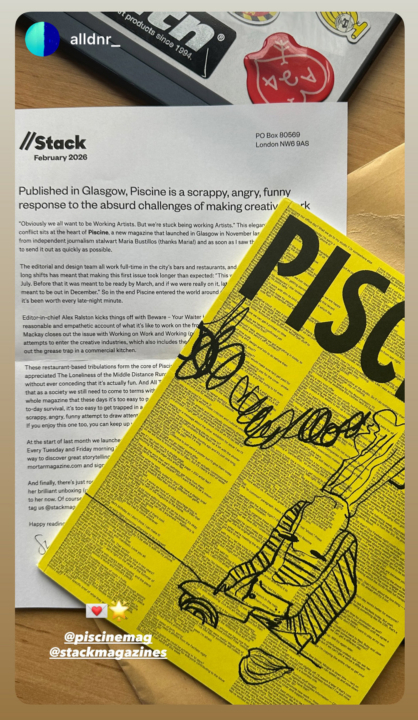 Piscine is an arts and culture magazine published in Glasgow by people who work full-time in the city’s bars and restaurants. This first issue is themed ‘Working on Work and Working’, with contributors trying to figure out how to balance the demands of their ‘real’ jobs with their ambitions to create something more meaningful.
