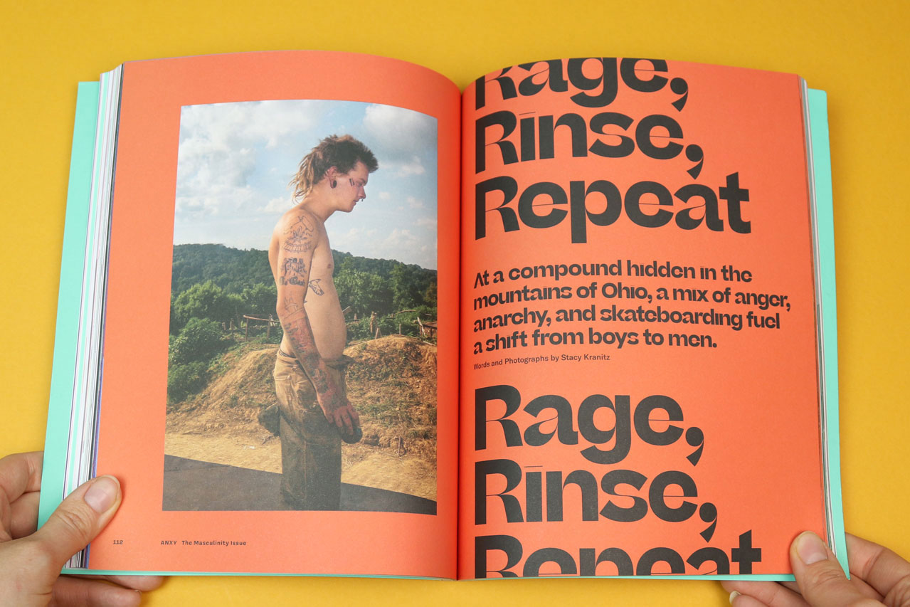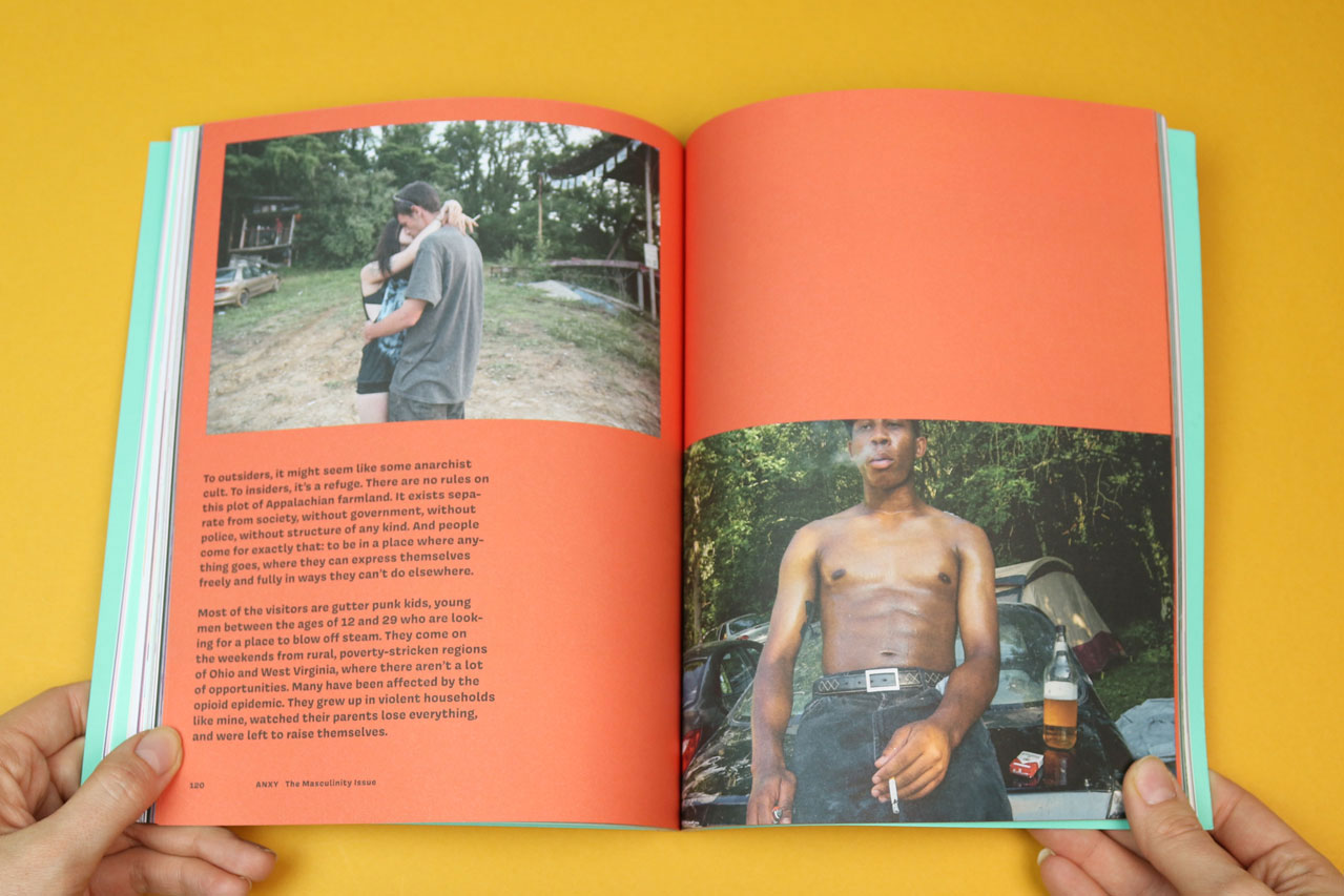 Threads of pain and partial resolution run through Anxy’s issue: a paramedic deployed to Afghanistan writes about his feeling that he didn’t do enough to help the soldiers in his care; a visual feature about rage and catharsis in a teen skate community in the Appalachian mountains is couched in the photographer’s need to work through her own violent upbringing. You feel, palpably, that it costs contributors to share like this, but that they must. Opening people up to their vulnerability is something every issue of Anxy tries to do, but it’s particularly important, Indhira tells me, in the context of masculinity. “To me that’s what is so beautiful about this issue: to witness the complexity of emotion experienced by men, who in my case, I often feel so fearful of.”