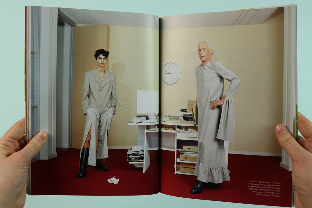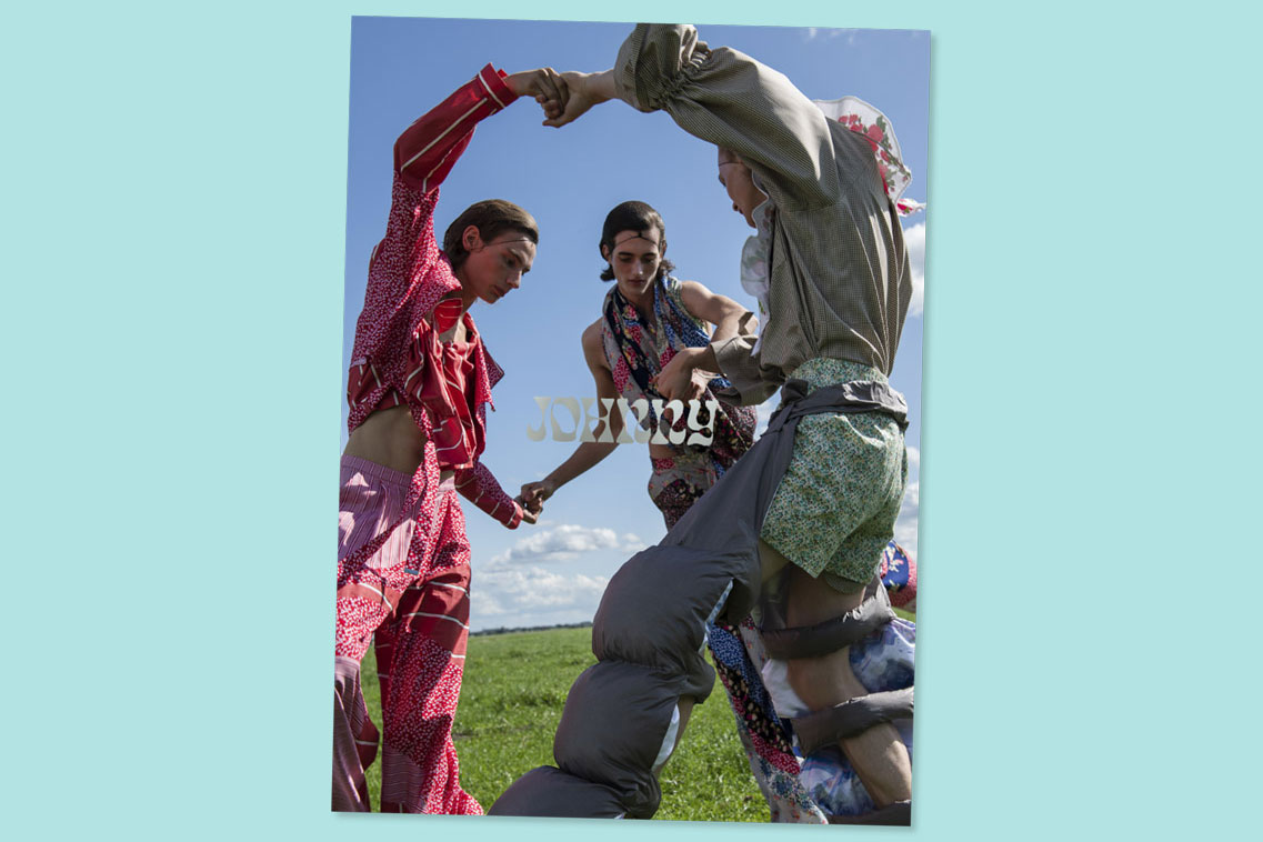 All the models in the magazine are referred to as ‘Johnny’, suggesting the power of clothes to free you from the illusion of fixed, infallible selfhood, and where the lads’ mags of the early 2000s were a space to shore up male identity with ‘man’ things like chunky watches, embarrassing accidents and High Street Honeys, Johnny is part of a new wave of independent print proposing something like collective emasculation: hacking away the old ideas of what it means to be a man so that something new and more interesting can grow in its place.
