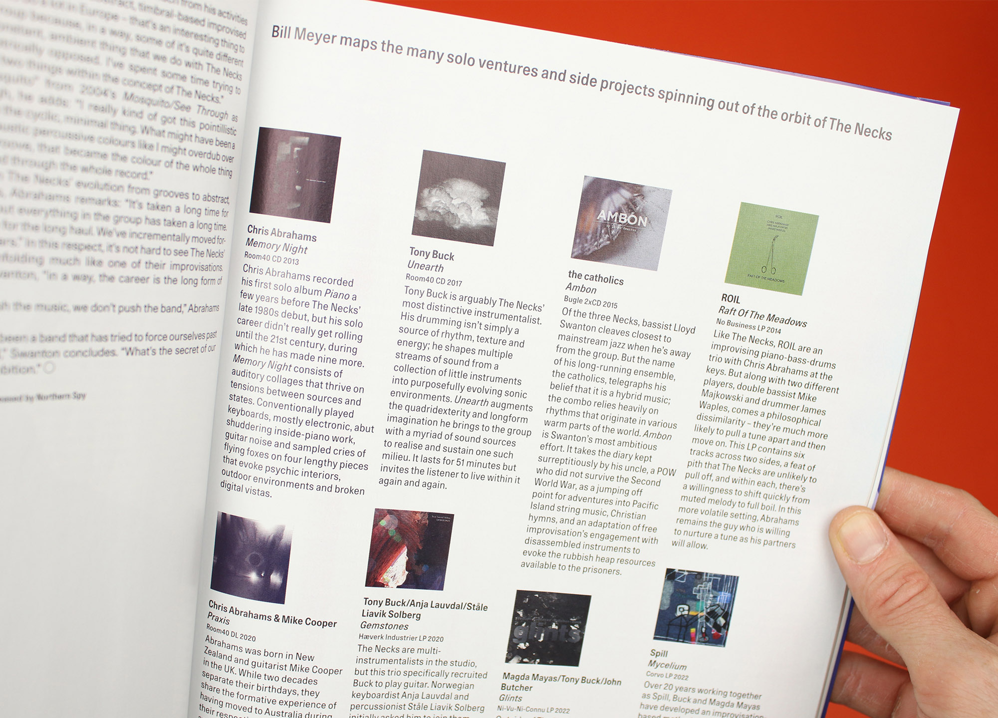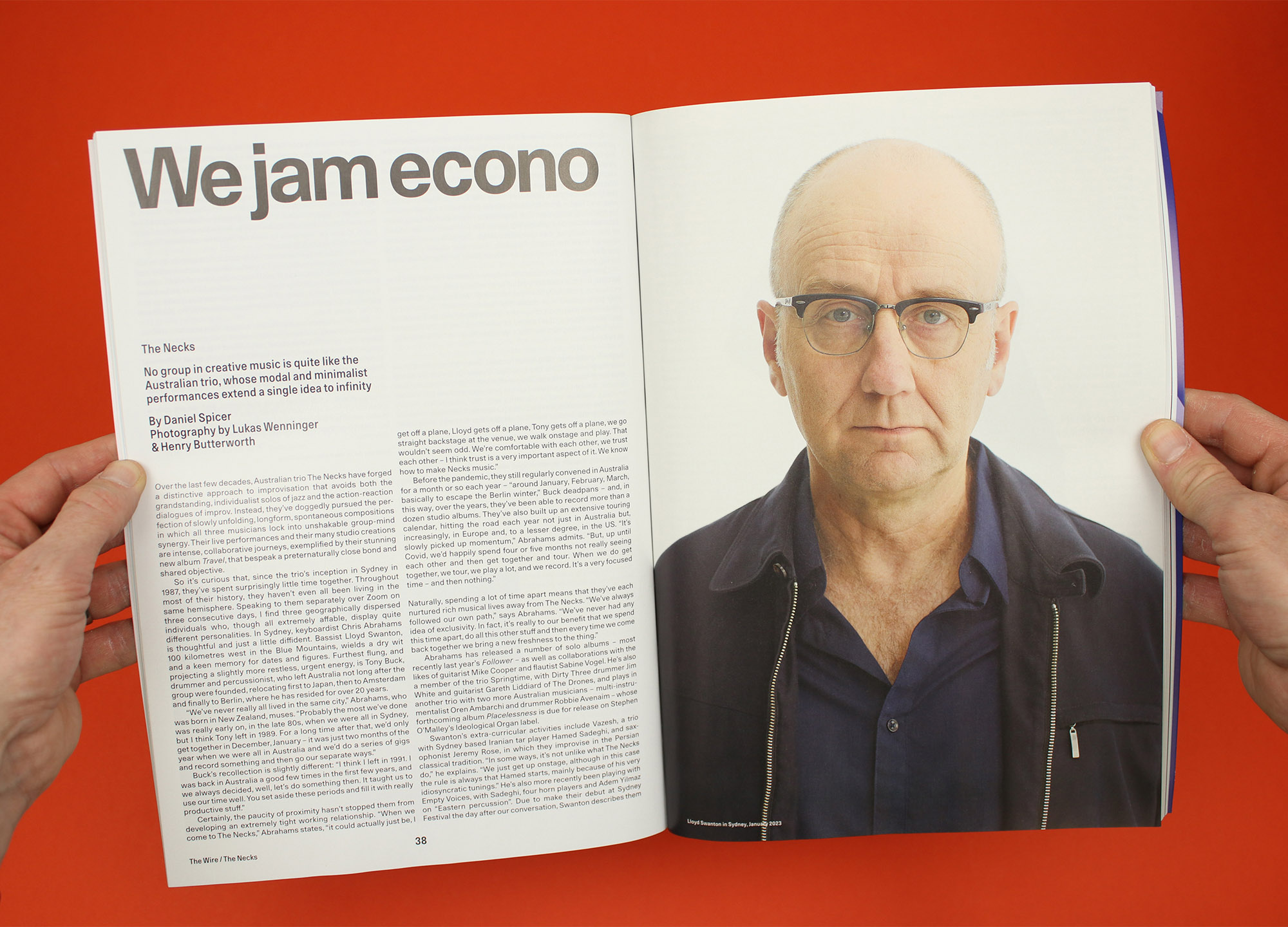 And before we get carried away with the austere simplicity of The Wire, I also like the sly piece of misdirection in its cover image, which seems to show Australian band The Necks photographed in the starkest studio shoot possible, only for the story inside to reveal that the three members were in fact photographed separately in Sydney and Berlin. It’s not a joke as such (in fact it’s really just a sensible way of showing three people who play together but don’t live near each other) but I like the way they’ve sneaked a little bit of magazine artifice into this apparently entirely earnest redesign.