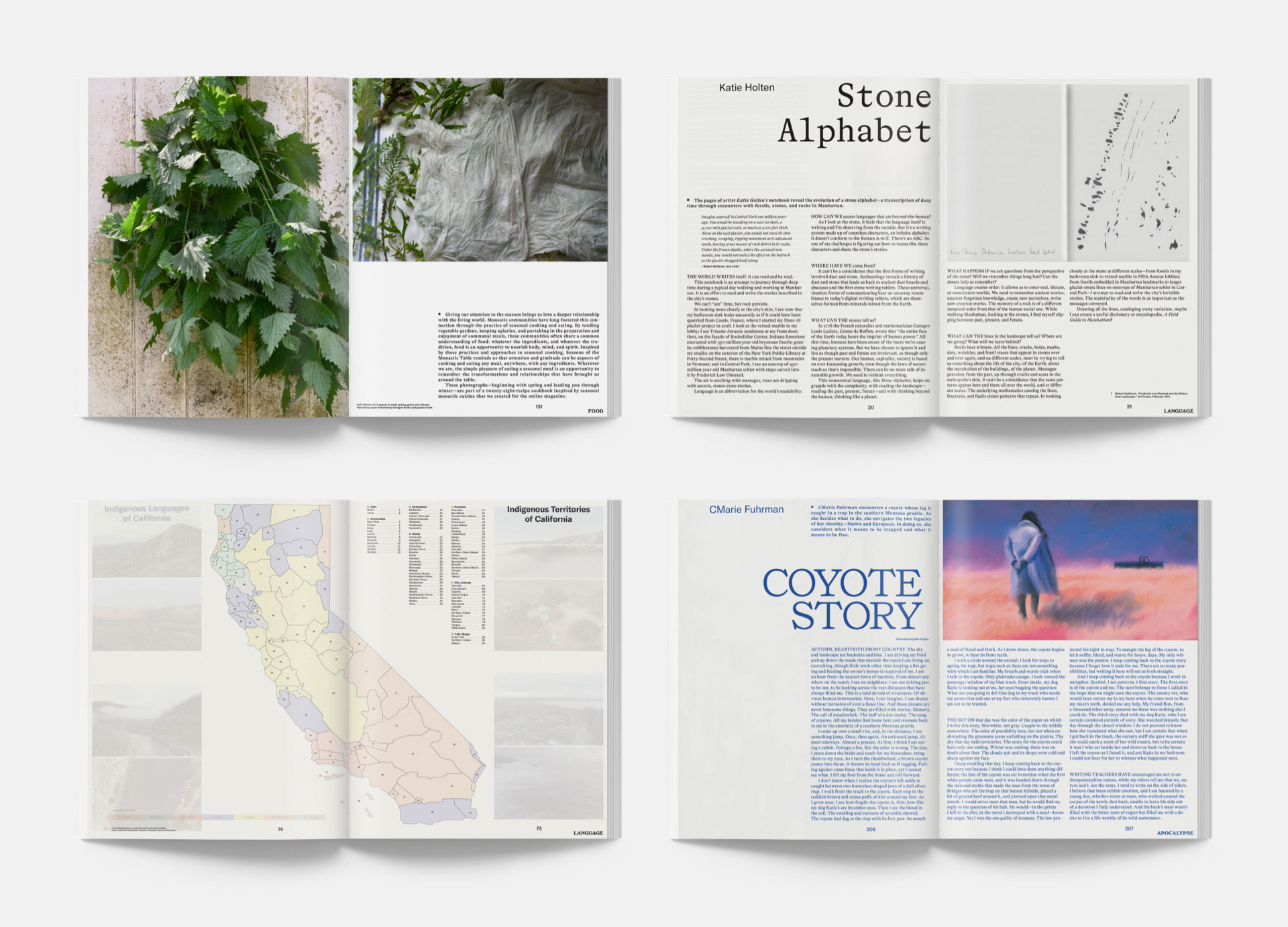 Emergence is a California-based magazine that explores “ecology, spirituality and culture”. A juicy 394 pages long, the content is divided into four sections; ‘Language’, ‘Food’, ‘Apocalypse’ and ‘Trees’. Contributions are long-form and often experimental. A poem about the tree that survived the atomic bomb in Hiroshima is printed on tracing paper, so that it looks like the rings in a slice of bark. In another of my favourite pieces, the ecological historian Bathsheba Demuth explores the imposition of Soviet ideology on the indigenous Chukchi people.