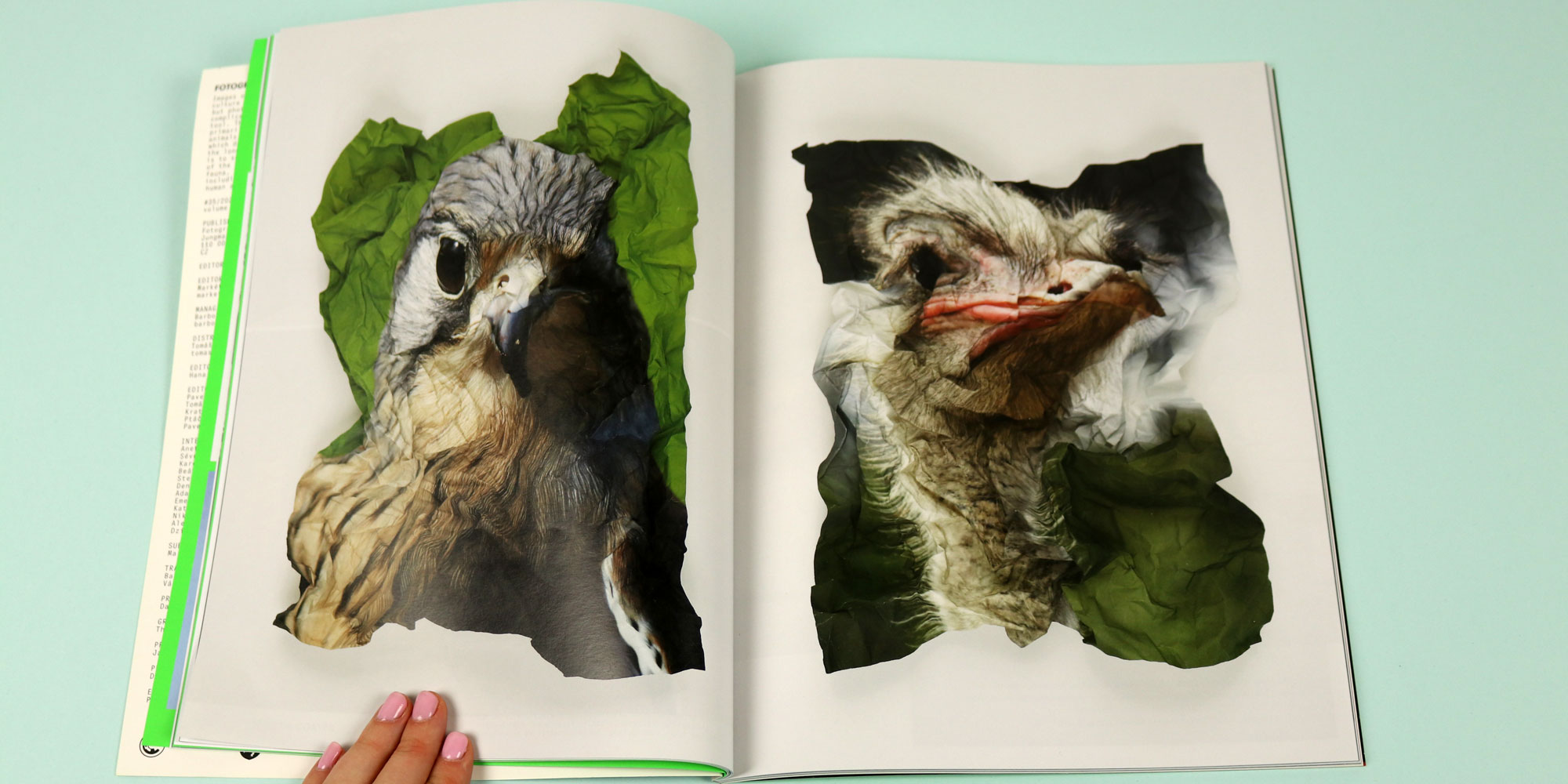 The work featured in this slim volume is remarkable for its unconventionality. You can imagine a run of the mill photography magazine churning out an issue on ‘living with animals’ and it being lots of moody ‘wildlife’ shots. Fotograf is doing something more interesting: one of the first features is about Marcus Coates, a photographer-cum-shaman who sometimes dresses up in a grotesque bird costume. In Ritual For Reconciliation (2013), Coates crumpled up photographs of wild animals and then laid them out on the floor. A reflection on the superstition that cameras “steal souls”, the work is a way of coming to terms with the distance of 2-D images, as well as a ritual attempt to renew the feeling of being together with the captured animal.