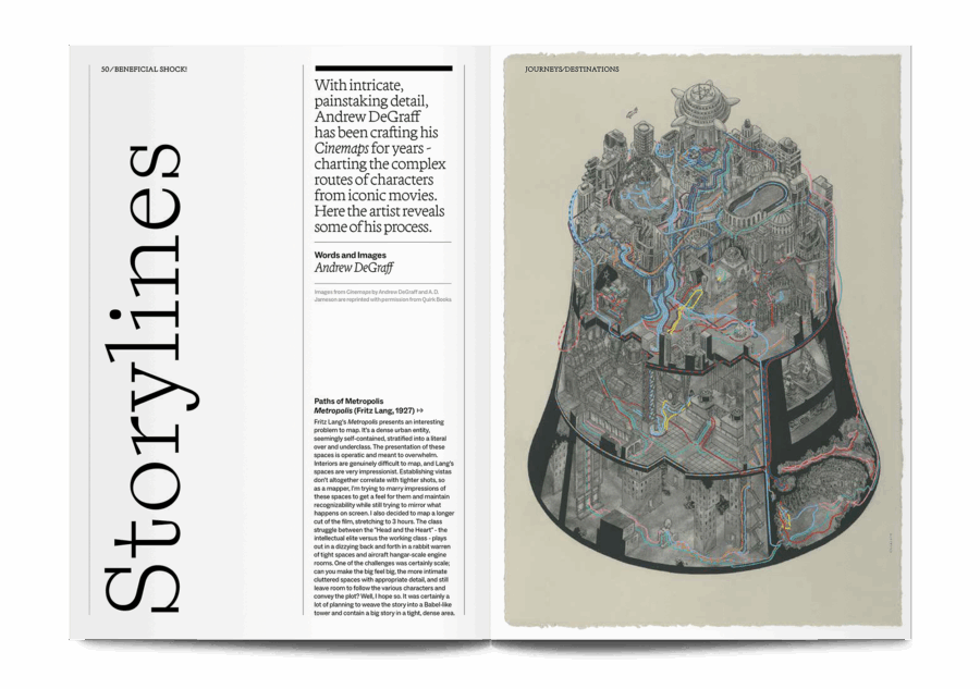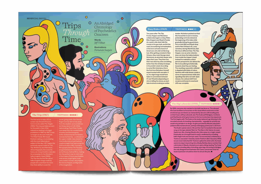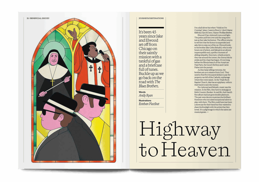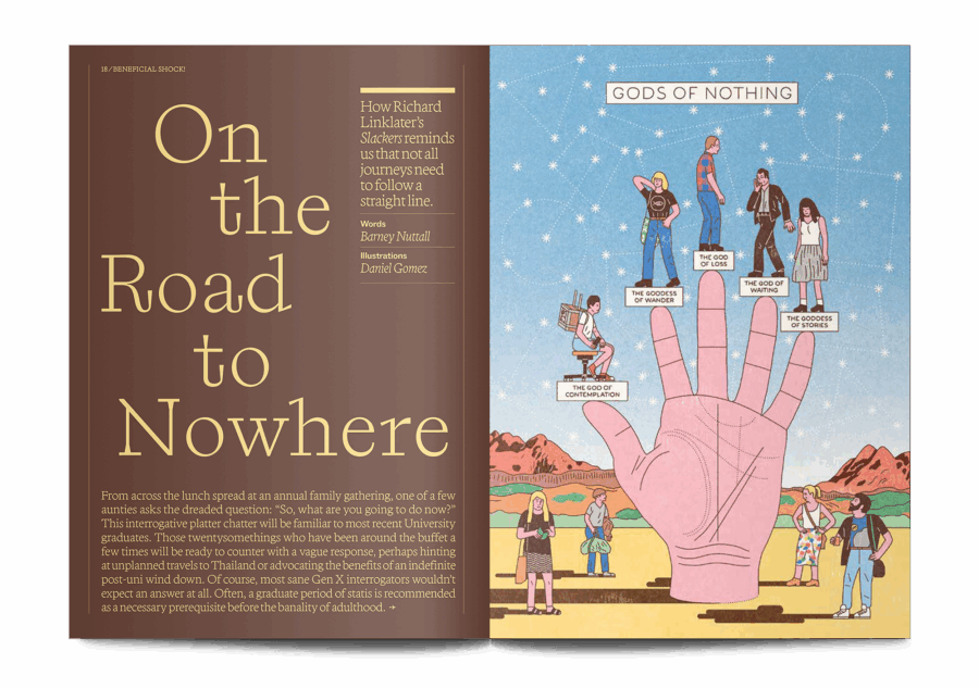 A movie magazine that loves illustration, Beneficial Shock! showcases personal responses to some of the world’s most beloved films. That means illustrators aren’t just asked to contribute their images – they also write about the movies that have most influenced their lives and work. This issue is themed ‘Journeys and Destinations’, with contributors reflecting on all types of travel, from road trips to emotional journeys to psychological adventures.