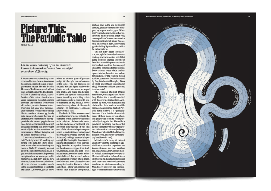 Taking an expansive approach to storytelling, Broadcast combines art and science as a way of looking beyond the everyday. Lots of magazines build their editorial around art, but I can’t remember the last time I read a story about the shape of the periodic table, let alone one that successfully explains how that shape, “encodes the character of the quantum atom”. It’s mind-blowing stuff, but rendered in totally accessible, entertaining text that’s as fun as it is enlightening.