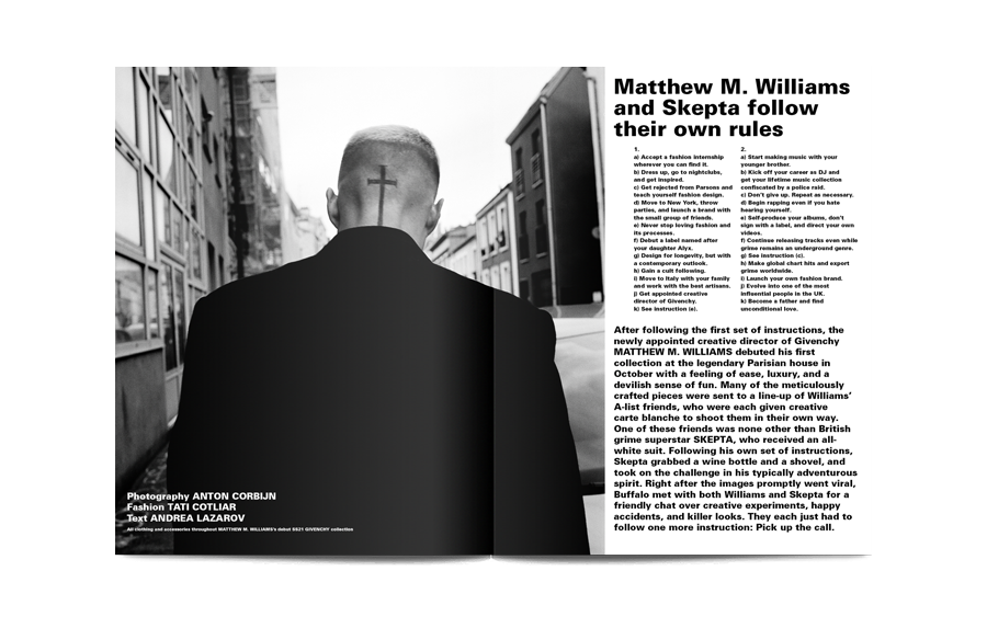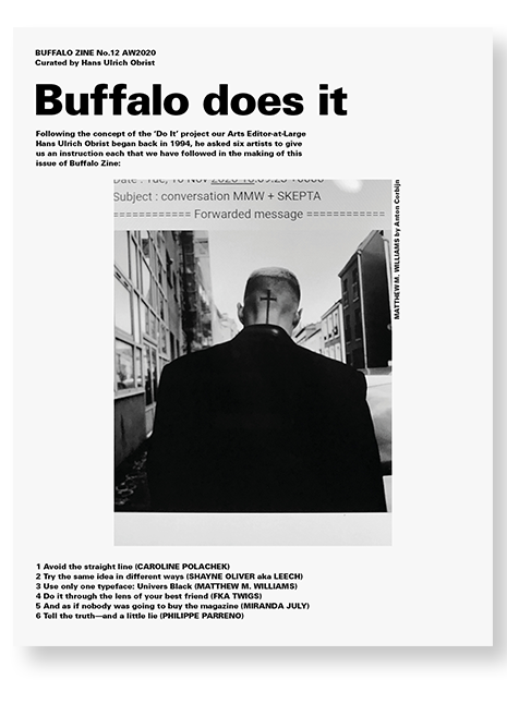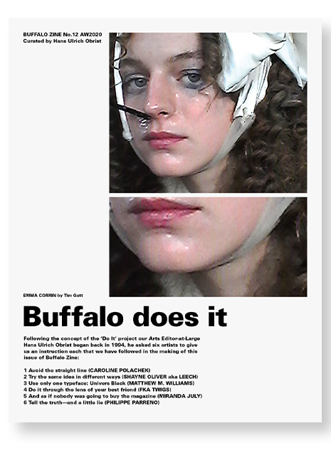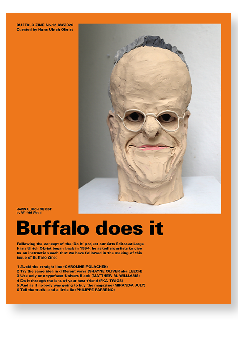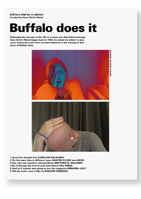 Buffalo Zine is a satirical fashion magazine with a cult following. This issue is a pastiche of the contemporary art world, using Hans Ulrich Obrist’s ‘Do It’ project as inspiration and asking six artists to each provide an instruction that must be followed in the making of the magazine.