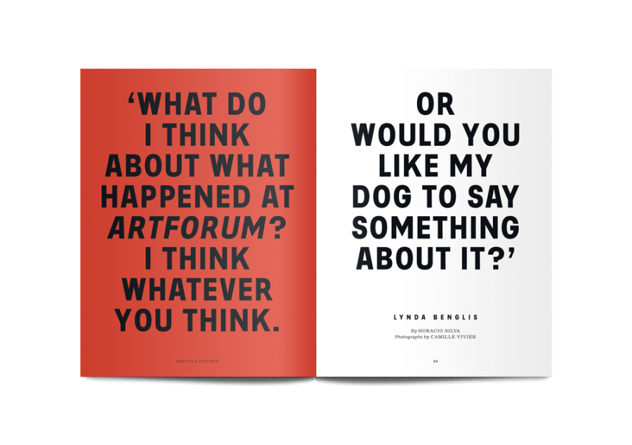 - An interview and photo series starring Lynda Benglis, responsible for one of the most provocative images of feminist art — an Artforum cover that got the editorial team sacked — about the “shit storm” of Trump’s America