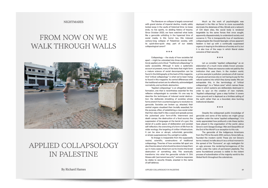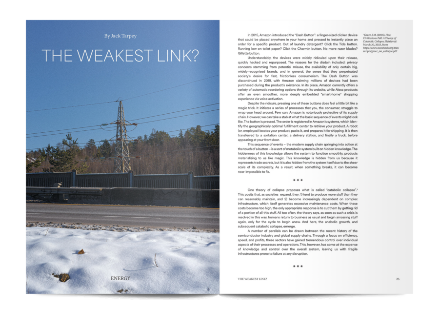 A magazine born out of the pandemic, Crude Futures is dedicated to examining notions of collapse. Covering a wide range of writing, from short fiction to long essays, and focusing on subjects including the environment, popular protest, war, and international supply chains, it uses systems-level thinking to understand what it means when our world falls apart.