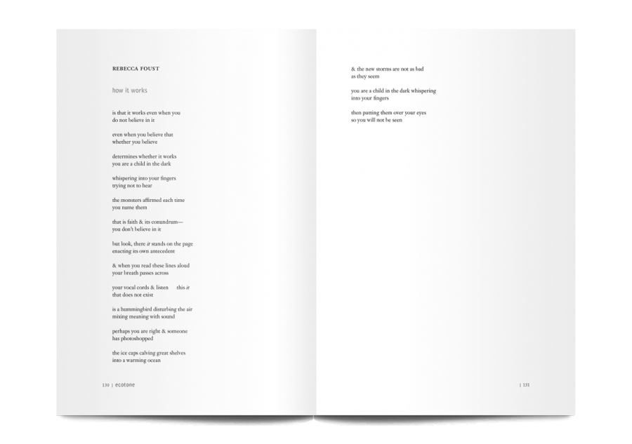 The titular ecotone is — as the magazine’s editor explains — “a transition zone between two adjacent ecological communities, containing the characteristic species of each… a place of danger or opportunity, a testing ground.” With that in mind, the magazine seeks to explore “the ecotones between landscapes, literary genres, scientific and artistic disciplines, modes of thought.”
