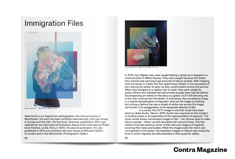 Exploring the relationship between art and conflict, Contra analyses the ways in which war and civil unrest are represented in visual culture. This first issue focuses on displacement, and includes original and affecting stories of migration across Europe and its visible and invisible borders.