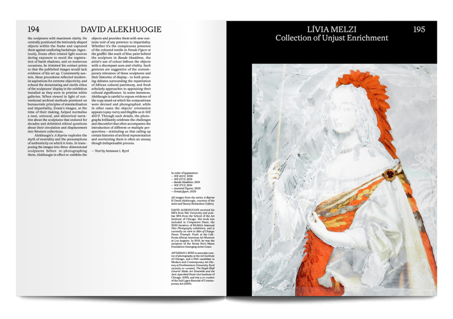 - Portfolios showing the works of artists such as Tavares Strachan, Alanna Fields, David Alekhuogie, Pacifico Silano, and Frida Orupabo