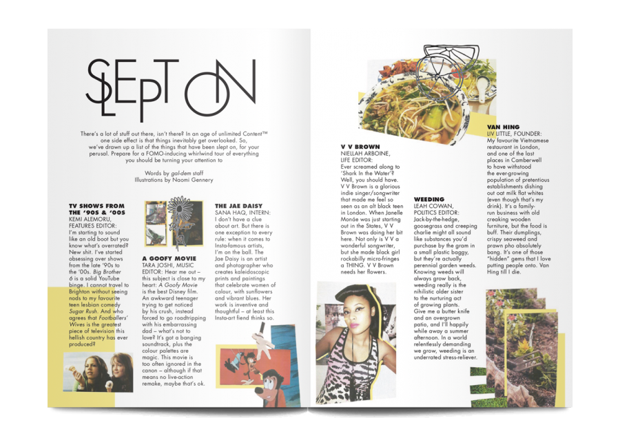 - A group interview with literary stars Candice Carty-Williams, Mariam Khan, Naomi Shimada, Yasmin Rahman, Victoria Princewill, and Jay Bernard, shot for the cover by visual artist Nwaka Okparaeke