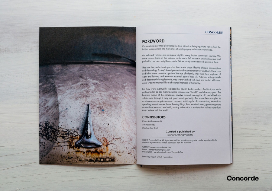 Concorde aims to bring photo stories from India to photography enthusiasts worldwide. Concentrating on just one subject per issue, this edition, ‘Abandoned’, takes forgotten vehicles, once loved but now left to rust, as a metaphor for urban consumerism.