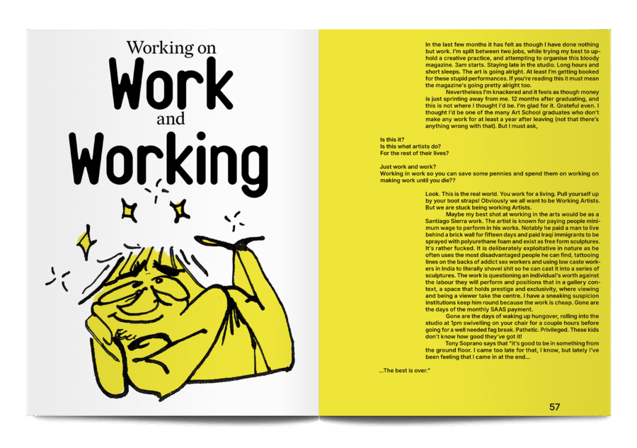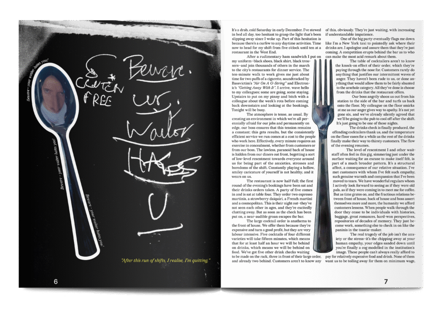 An arts and culture magazine published in Glasgow, Piscine is made by an editorial team that works full-time in the city’s bars and restaurants. This first issue is themed ‘Working on Work and Working’, and it grapples with the difficulties of working in hospitality while also trying to pursue a career in the arts.
