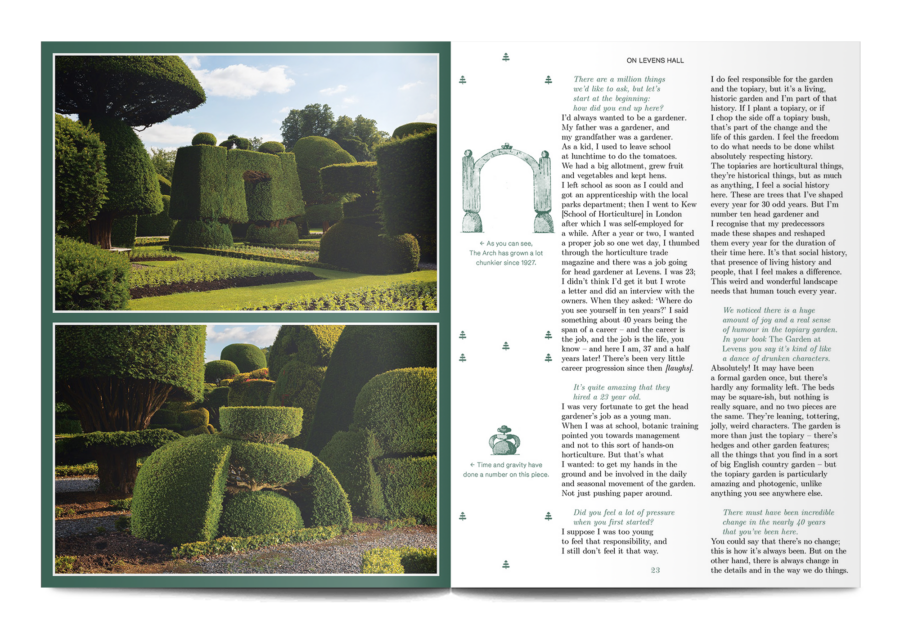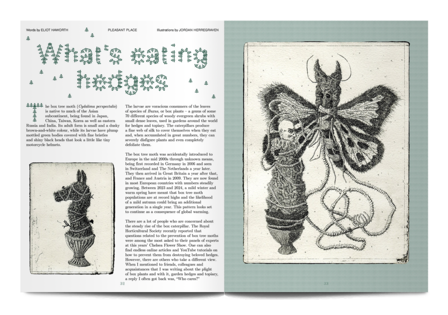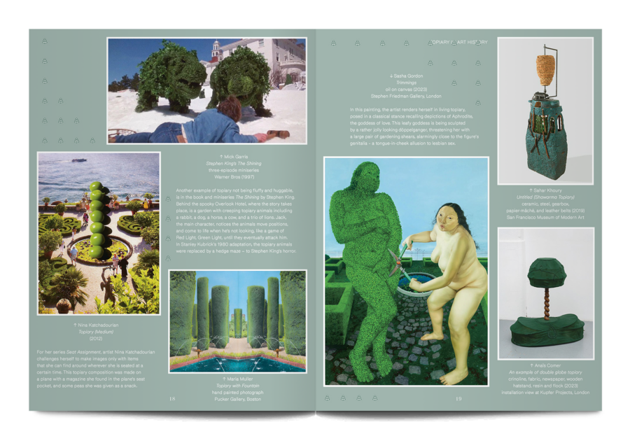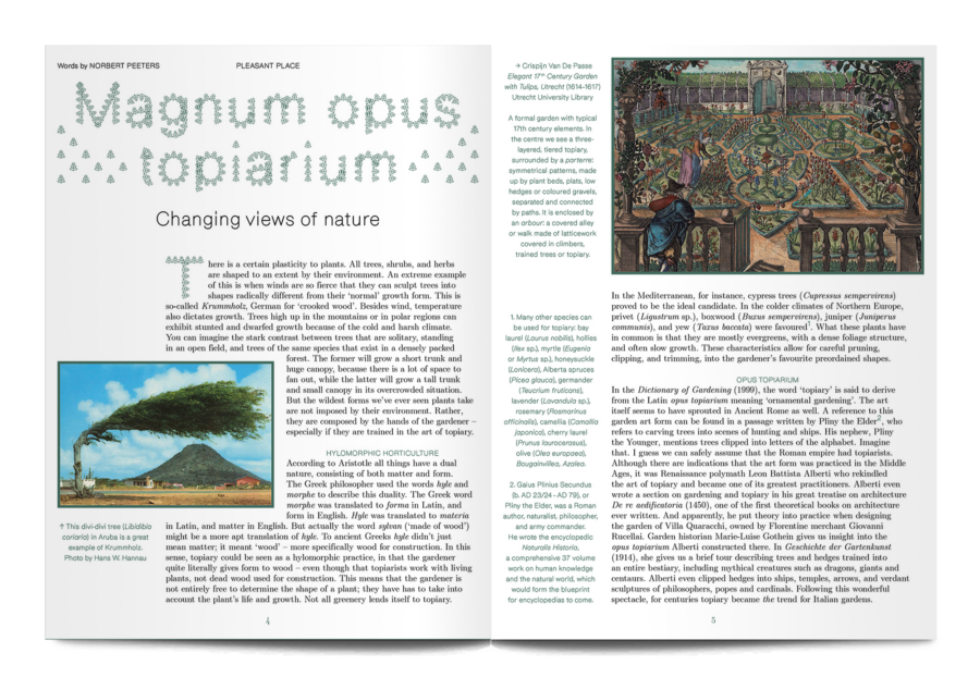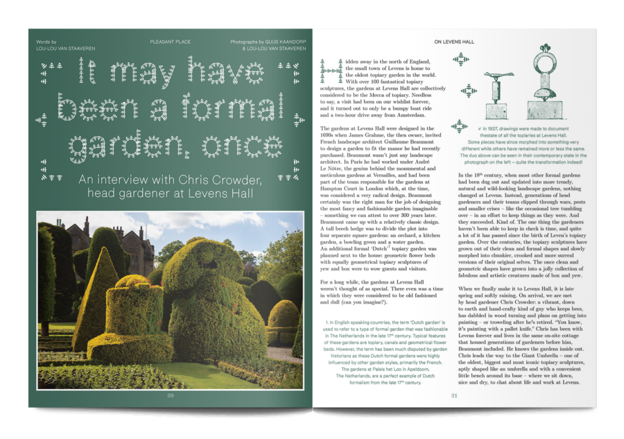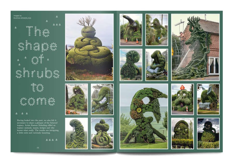 A small and beautiful magazine from Amsterdam, Pleasant Place considers the art of gardening. This sixth issue is themed ‘Topiary’, and it digs into the history of cutting trees and hedges into strange shapes, as well as the most recent developments in this human compulsion, “To force the unruly natural world into submission, as if we were tiny gods on earth.”