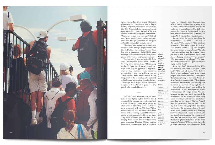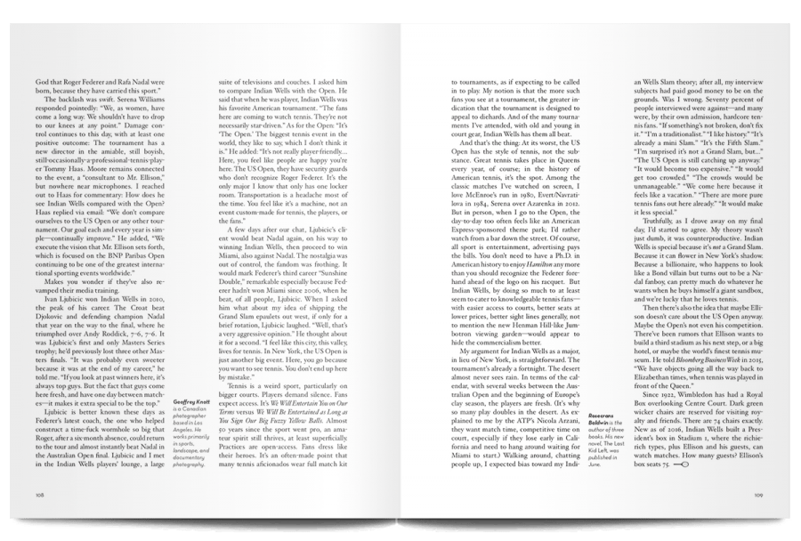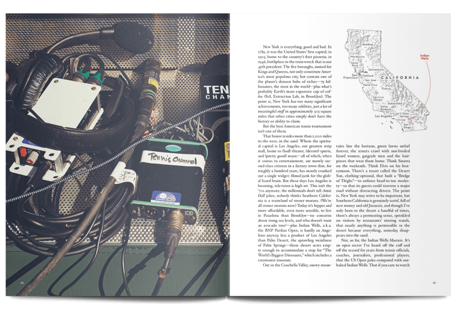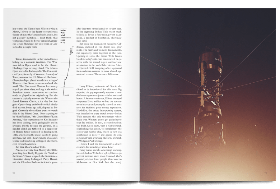 The rest of the articles in this issue aren’t as literally literary as that first piece, but there’s a scope and ambition that continues to operate on the highest levels of human experience. Writing about John McEnroe’s inglorious later career, for example, Stephen Tignor explains the absence created by Bjorn Borg’s retirement: “He had idolized Borg, and their duels lingered in his mind as a kind of paradise lost, one that he would never regain with any other player on tour.”